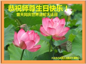 黑龍江省大慶市八百垧大法弟子夫妻恭祝師尊生日快樂!普天同慶世界法輪大法日!