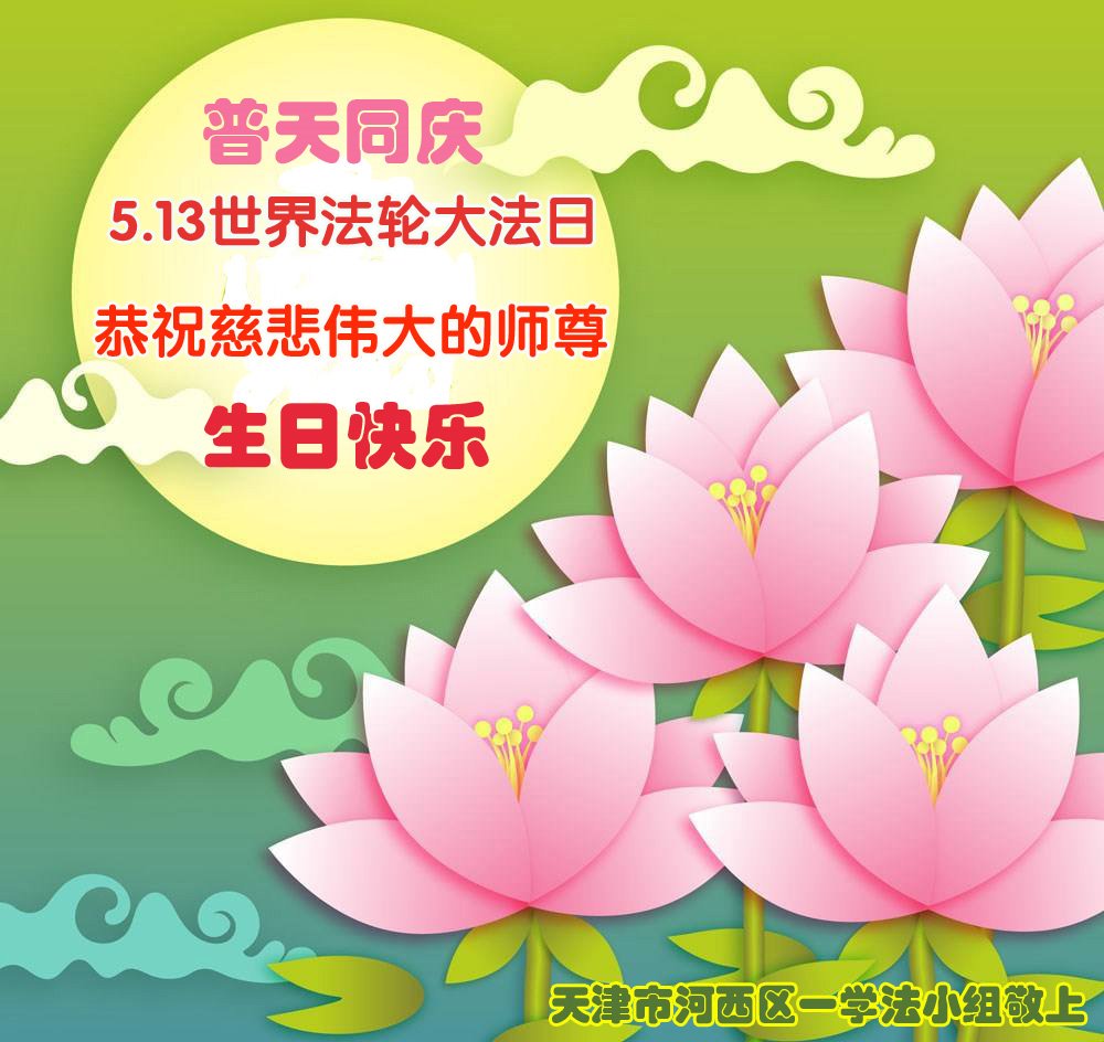 天津大法弟子恭祝慈悲的師尊生日快樂!普天同慶世界法輪大法日!法輪大法洪傳世界二十六週年!