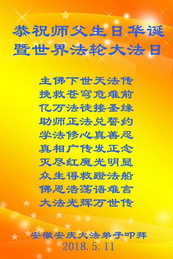 安徽省馬鞍山市和縣全體大法弟子恭賀2018年世界法輪大法日!敬祝慈悲偉大的師父生日快樂!