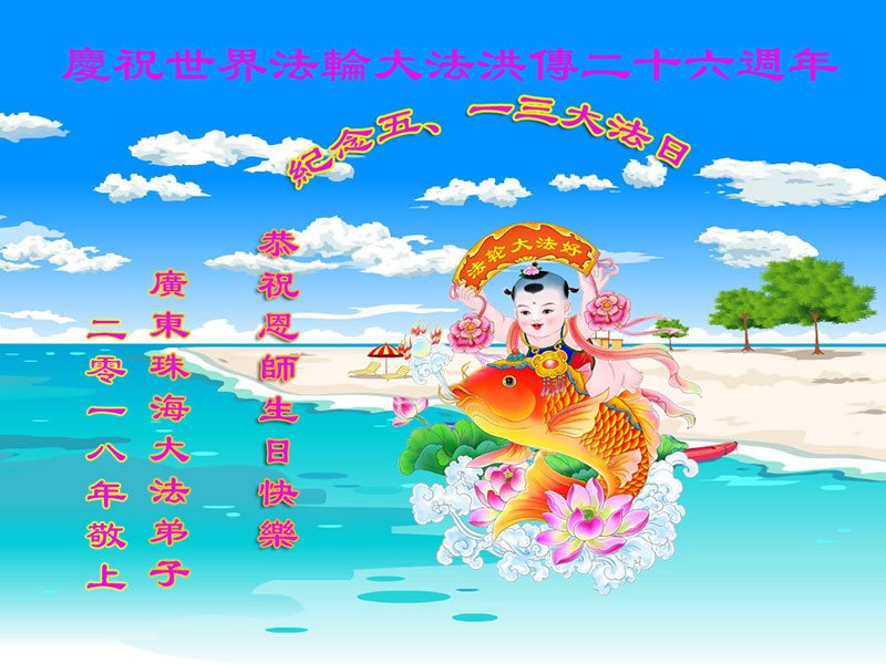 二零一八年五月十三日是慈悲偉大的師尊華誕,廣東省台山市全體大法弟子同祝、同頌、同慶師尊華誕!普天同慶法輪大法洪傳二十六週年。在五月十三來臨之際,我們台山市全體大法弟子恭祝師尊生日快樂!叩拜師尊!合十!我們要珍惜師尊用巨大延長來的時間,用盡人類的語言都無法表達師尊對大法弟子的慈悲苦度,作為大法弟子唯有認真學好法、遇事向內找、正念正行、救度更多的眾生、兌現誓約,才能不辜負師尊苦度。