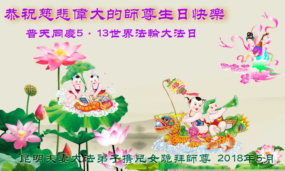 雲南昆明夫妻大法弟子攜兒女恭賀5.13世界法輪大法日!