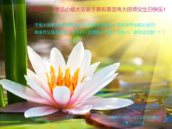 濟南歷下一學法小組大法弟子恭祝慈悲偉大的師父生日快樂!恭祝世界法輪大法日!感謝師父慈悲救度,弟子們一定做好三件事,多救人,跟師父回家!