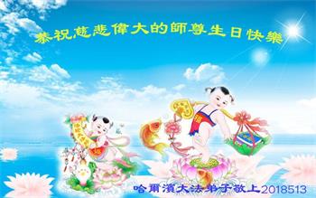 五月十三日是世界普天同慶的法輪大法日,是我們偉大師尊的生日,弟子及家人恭祝師尊生日快樂!師父您辛苦了!我們全家人感恩師尊的慈悲救度,對師尊的感恩無以言表!弟子的家人雖不修煉,多年來相信大法,一直支持大法弟子所做的救人的事,同時他們也得到師父的護佑,在大法中受益。請師尊放心:弟子在今後的修煉路上,繼續做好自己該做的事,修好自己多救人,弟子等待師父回大陸的那一天,同師父一起回家。謝師恩!跪拜師尊!