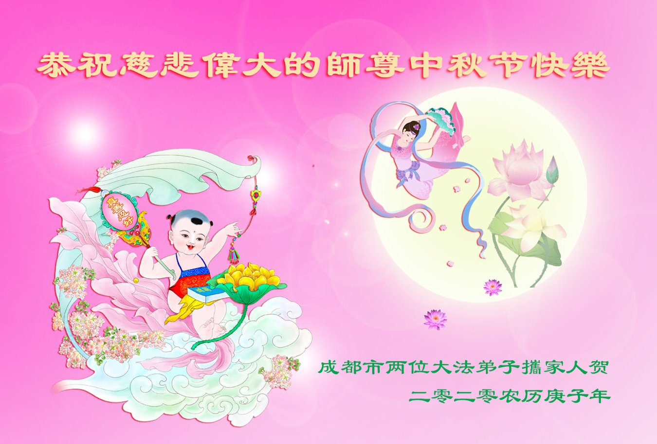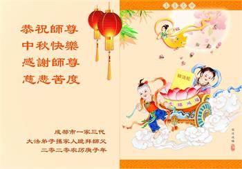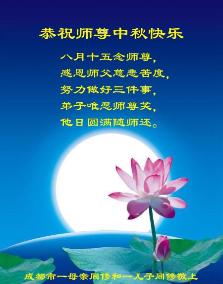 師父好,值此中秋佳節,恭祝您和家人中秋快樂!十分感謝您的慈悲苦度,我們家裏的修煉人因為您的救度,思想境界昇華了,身體素質改善了;家裏還未修煉的家人因為您的慈悲,平平安安,健康喜樂。請師父放心,我們會堅持做好三件事,不辱使命,助師正法。