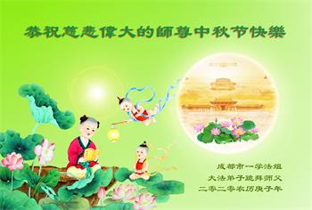 成都市一老年學法小組大法弟子恭祝師尊中秋快樂!在最後的時間裏做好大法弟子的三件事,感恩師尊的慈悲救度,師尊您辛苦了!