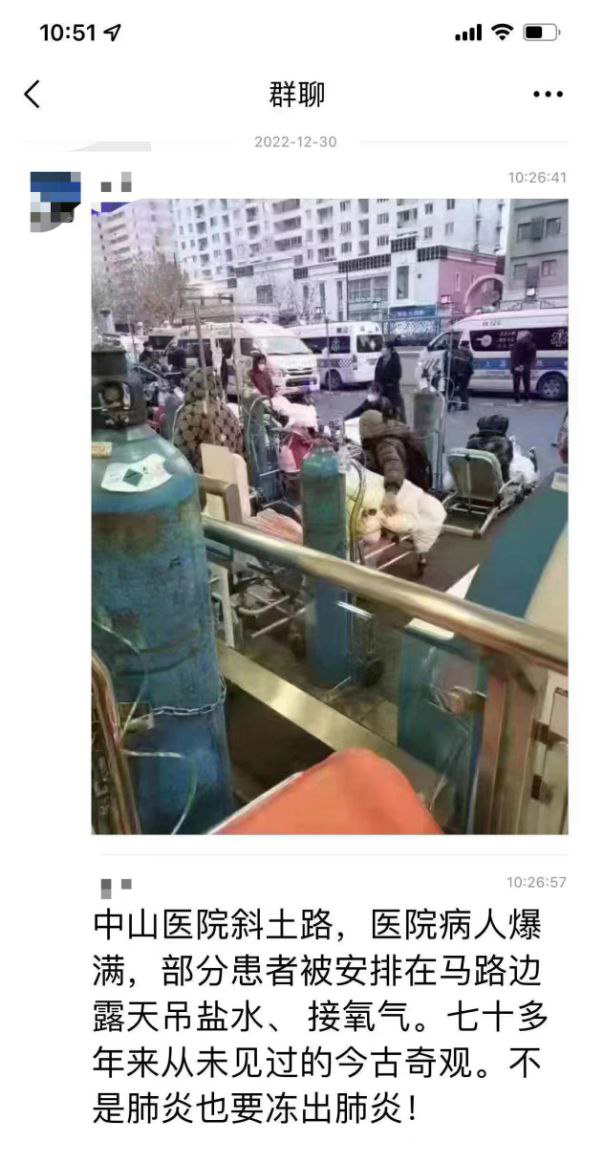![]() 圖:上海中山醫院斜土路分院,病人爆滿,部 份患者被安排在馬路邊露天吊鹽水、接氧氣。 |