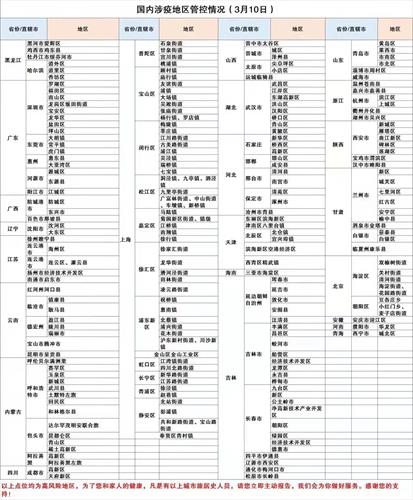 二零二二年三月十日,中國大陸上海市、吉林省、廣東省、雲南省、河北省、內蒙古等二十三個省市出現疫情嚴重地區,其中上海市十一個區出現疫情高風險區,吉林省七個市出現疫情高風險區。