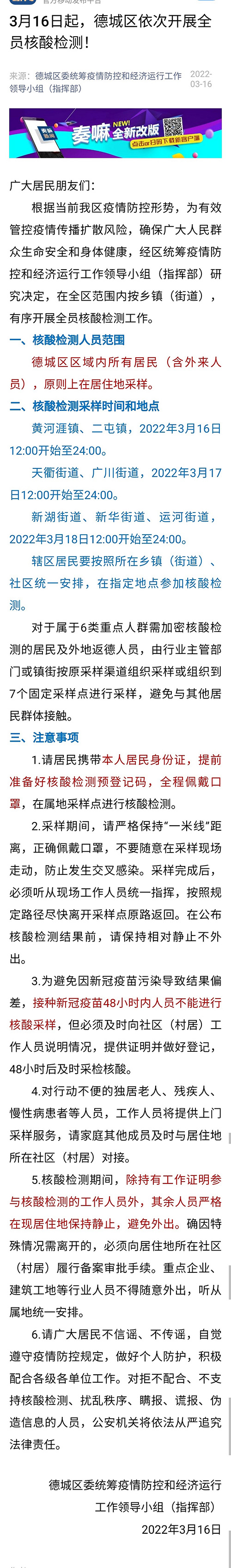 山東淄博全區進行全員居家核酸檢測已經三天。據悉,山東招遠市全市範圍原定持續五輪的核酸檢測大部份已進行到兩輪,在今晨凌晨(三月十六日)緊急叫停,原因不明。而德州市德城區官方沒有報導有感染病例,但是三月十六日起,全員進行核酸檢測。
