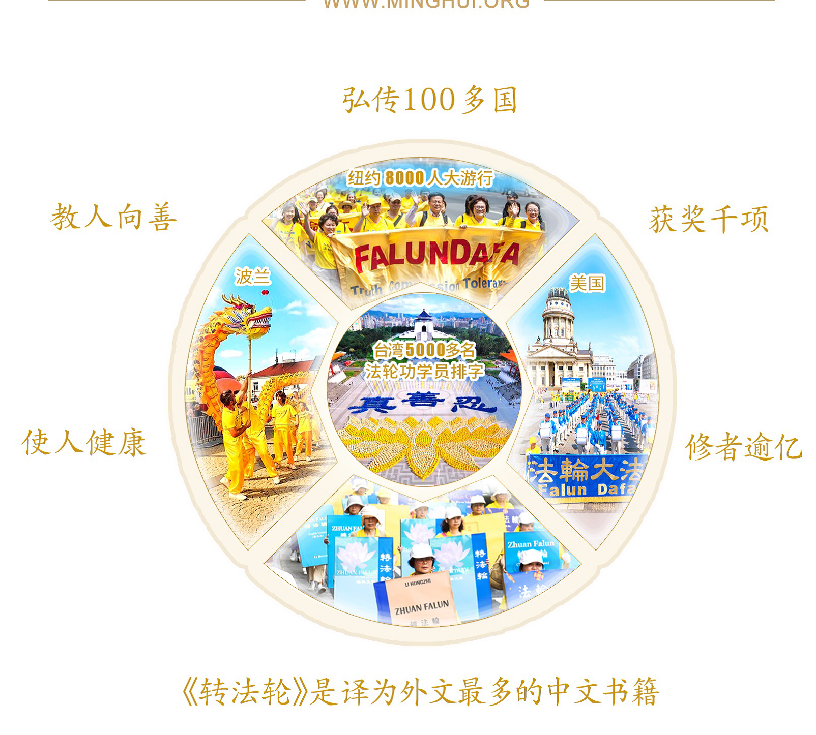 1、法輪功也稱法輪大法,是佛家上乘修煉大法,以真、善、忍為根本指導,包含五套舒緩優美的功法,使人道德昇華,身心健康。一九九九年七月二十日當年迫害法輪功時江澤民喊出三個月要消滅法輪功 。如今對法輪功迫害超過了二十二年,不但沒有倒下,反而更加宏偉壯大,現已弘傳世界一百多個國家和地區,榮獲各類褒獎3600多項,受到世界人民愛戴和尊敬。主要著作《轉法輪》被翻譯成四十多種語言文字出版,是漢語書籍被譯成外國語種最多的書籍。法輪佛法弘傳全球,福益世界,好評如潮!