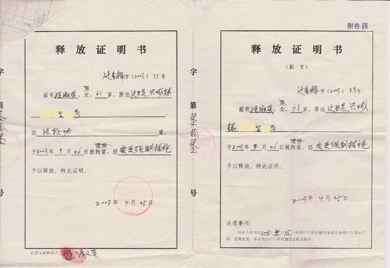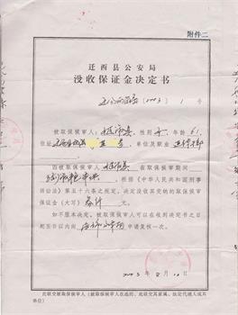 被非法關押一個月後,二零零三年四月二十五日,我被取保候審回家,我家人被勒索三千元保證金。後來保證金被編造一個與他人串供的理由而沒收。