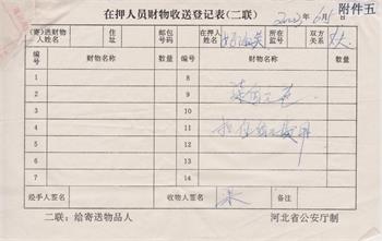 三、二零零三年六月三日──六月二十三日,我被非法刑事拘留,關押在唐山市第二看守所。辦案人:王印廣、何連鎖、朱振剛。強加的罪名是「因涉嫌傳播恐怖信息罪」。六月二十三日,家屬和單位(遷西經貿委)簽保證書,釋放。