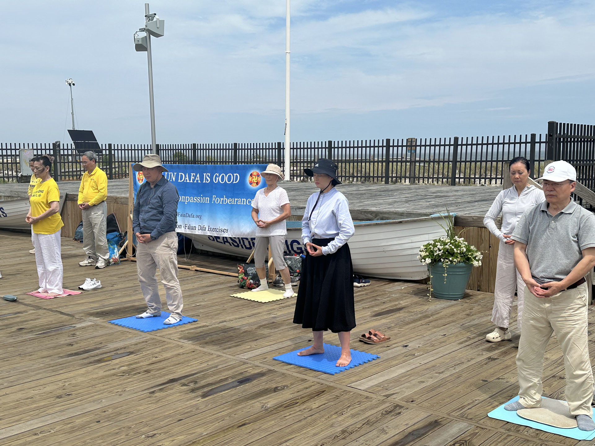 ![]() 圖2~4:新澤西州法輪功學員在海濱高地鎮木板路上展示功法。 |