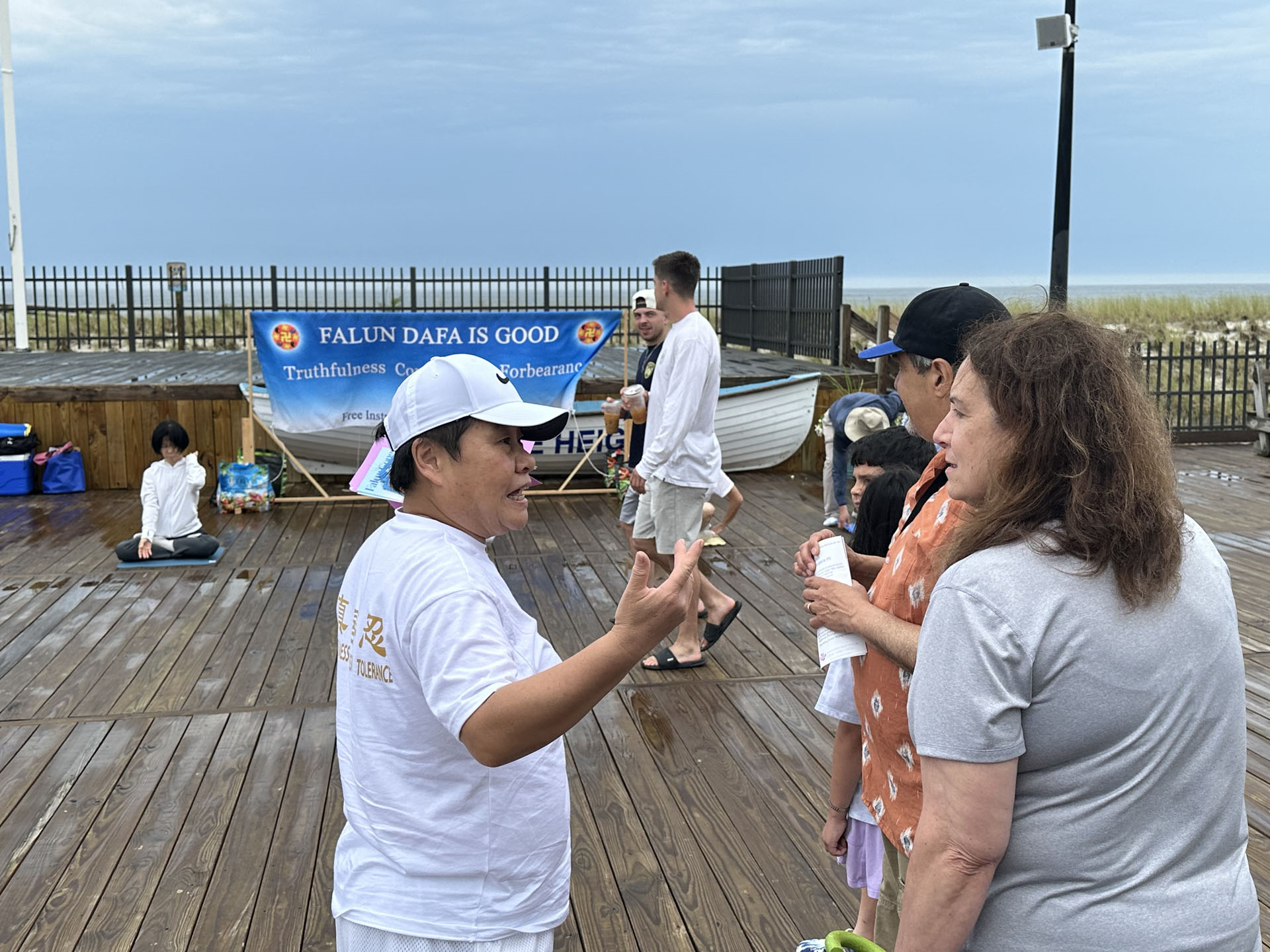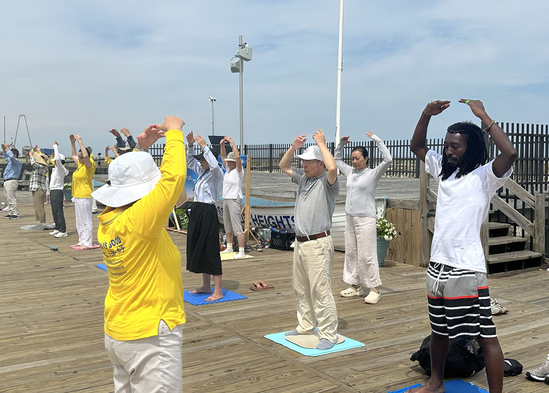 ![]() 圖1:法輪功學員在海濱高地鎮木板路上展示功法,吸引遊客們主動要求學功。圖為羅格斯大學的年輕學生們在學習第二套功法。 |