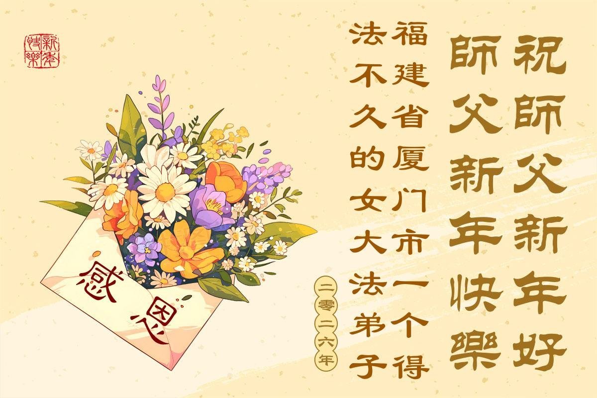 這是我第一次給師父寫新年賀卡。我是今年才開始讀《轉法輪》並開始煉功的。慢慢的知道了越來越多的真相,我希望未來會有更多的人知道真相,更多的人可以得法。大法改變了我以前很多不對的思想。我還有很多不足的地方,還需要繼續改進。最後我想說:願師父少一些操勞,多一些欣慰!