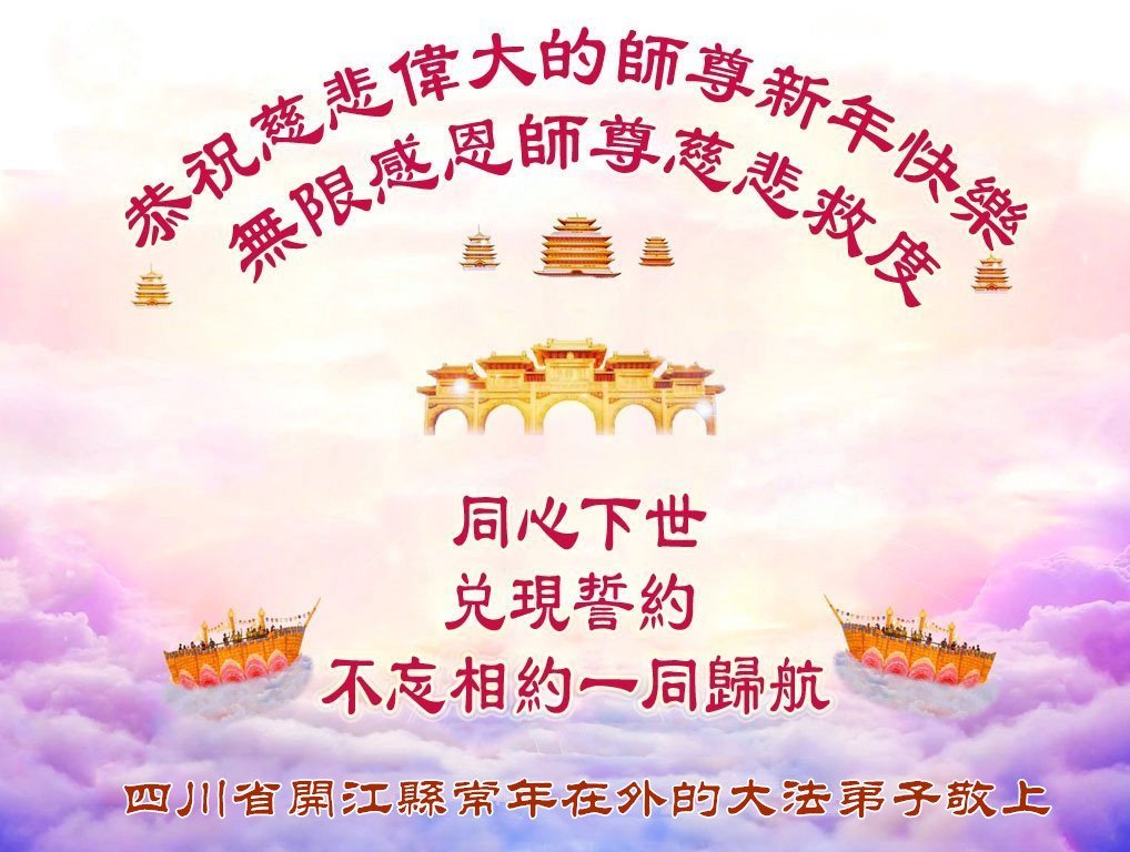 感恩師父的慈悲看護、加持!在新的一年裏,在師父延續來的時間裏,我們一定相互配合好,學好法,發好正念,做好三件事,多救世人。做好大法弟子該做的事,讓師父放心,跟師父回家。