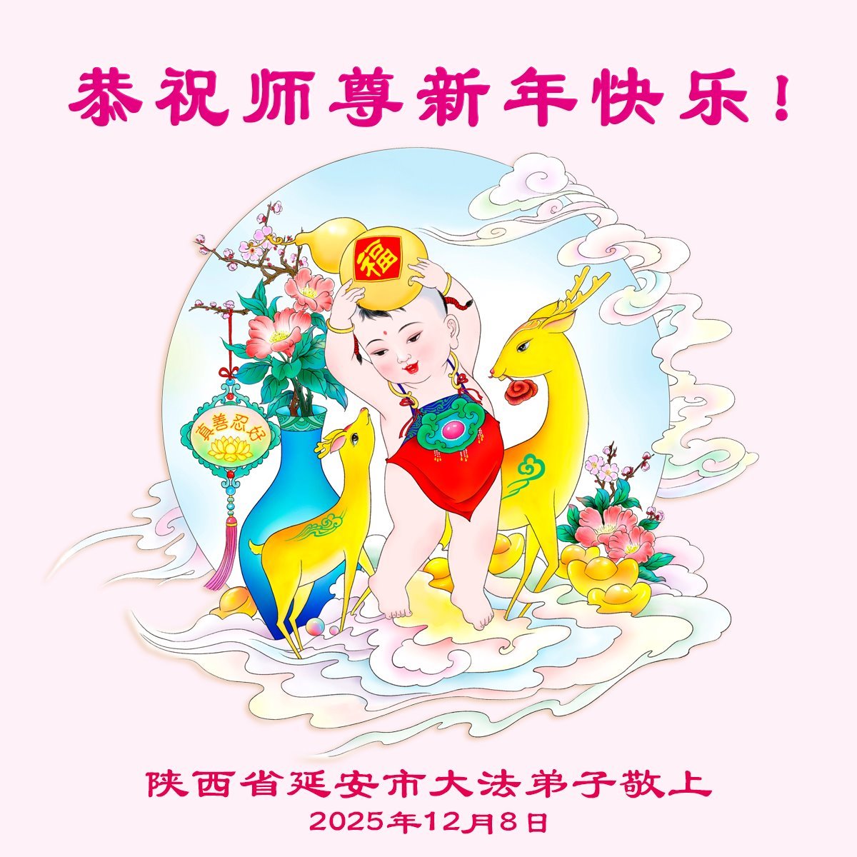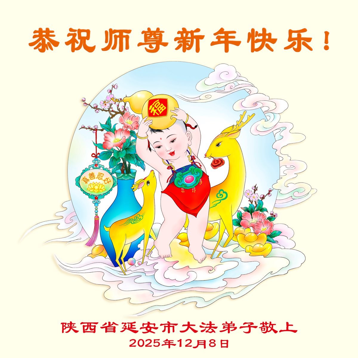 慈悲偉大的師尊您好,您辛苦了!在2026年新年來臨之際,弟子懷著萬分感恩的心敬祝師尊新年快樂!感恩師尊的慈悲救度,使弟子成為一個幸運又幸福的法輪大法修煉者,弟子叩謝師尊救度之恩!