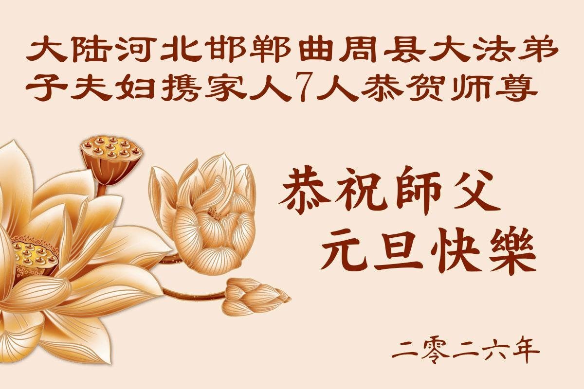 河北邯鄲曲周縣大法弟子夫婦攜家人7人恭祝師尊元旦快樂!
