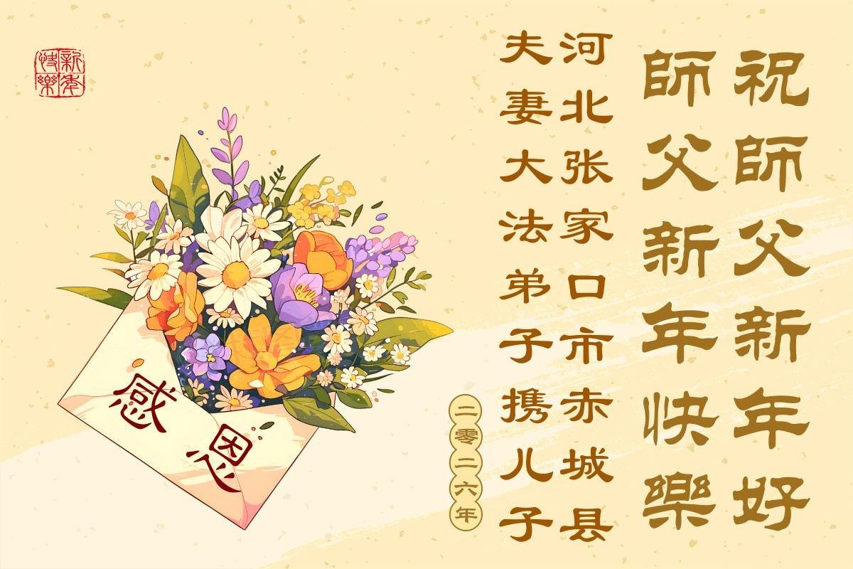 河北省張家口市赤城縣夫妻大法弟子攜兒子恭祝師父新年好!