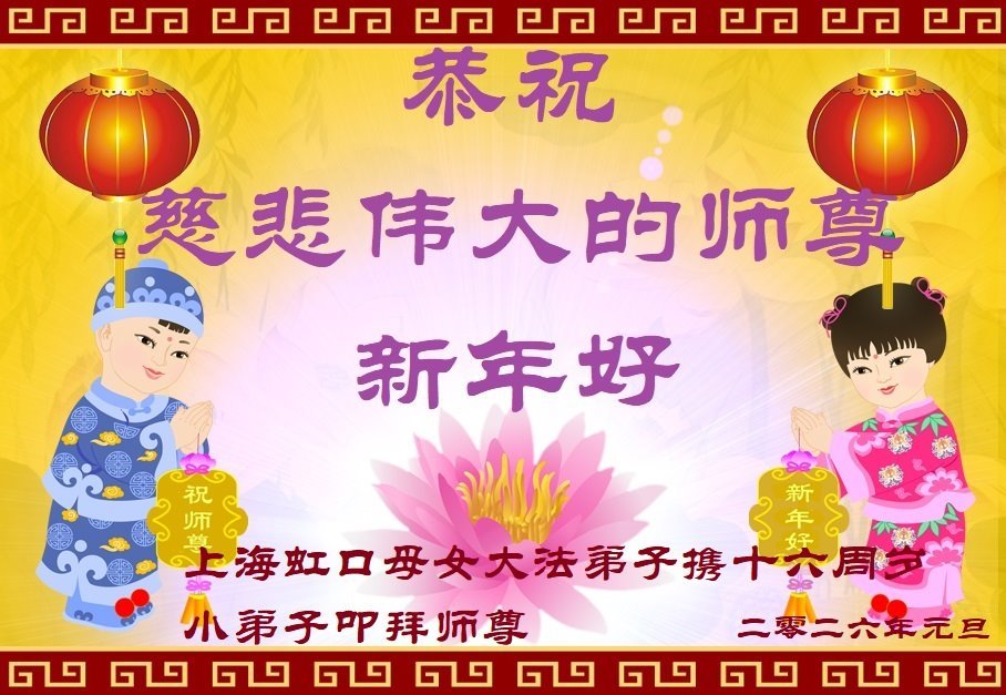 上海虹口區母女大法弟子攜十六週歲大法小弟子恭祝師尊新年好!並叩拜師尊!