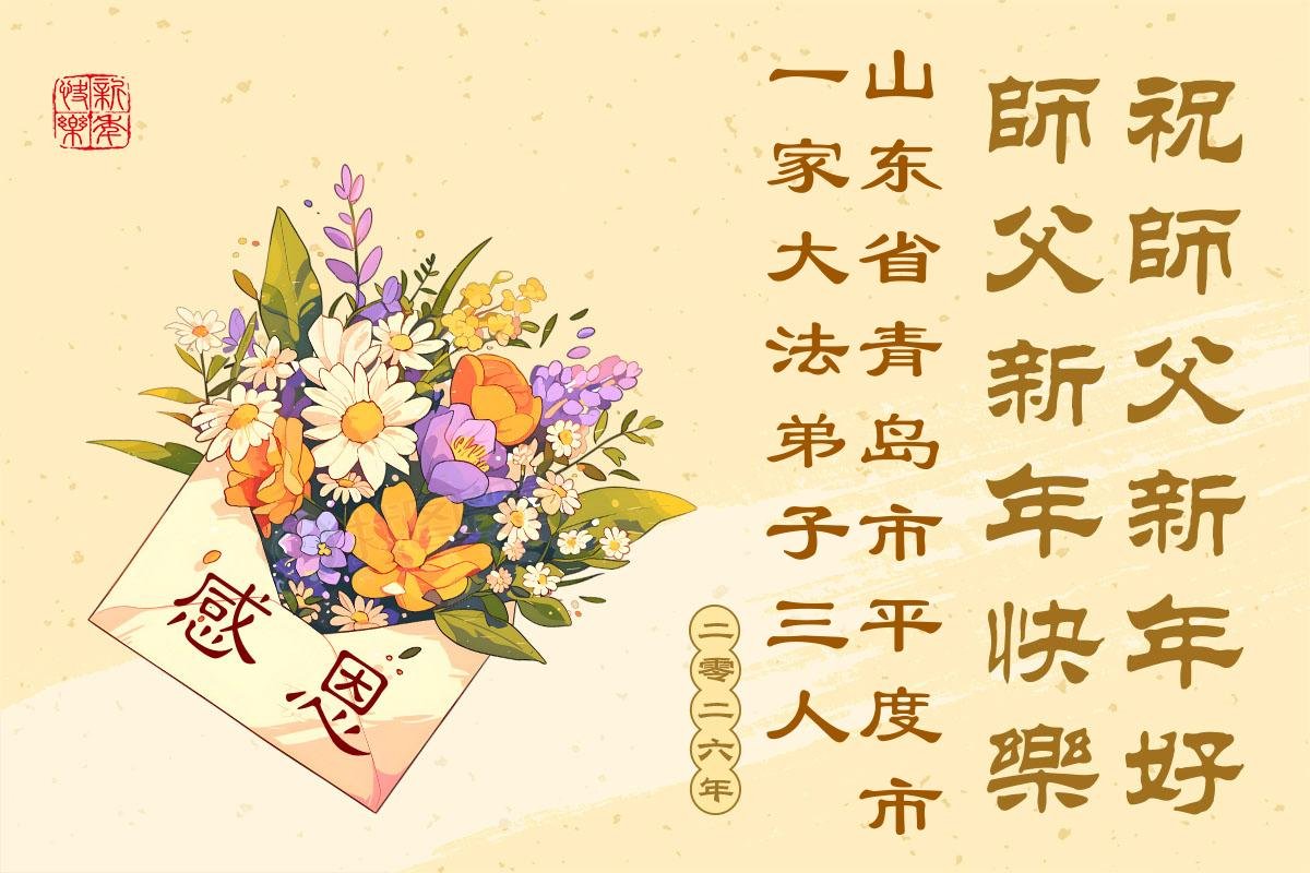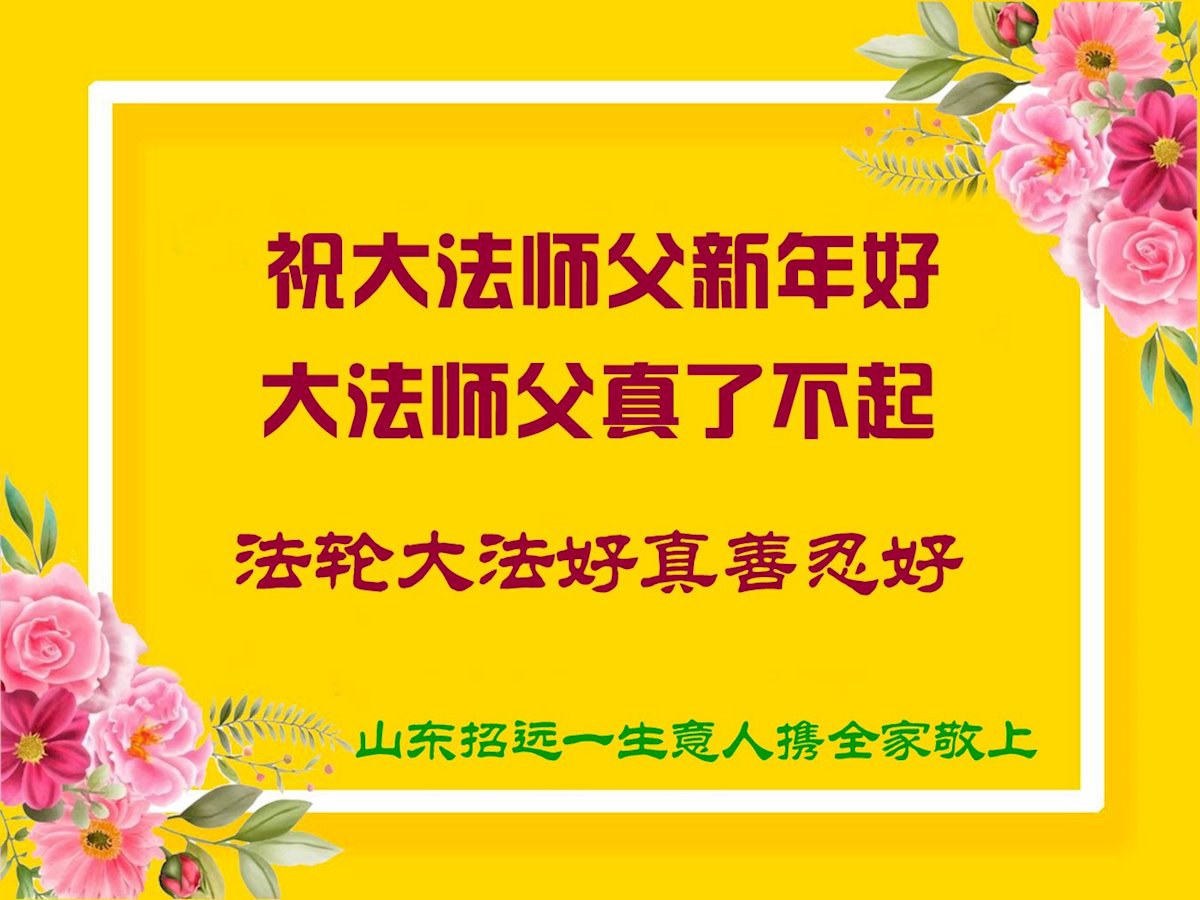 我是大法弟子家屬,感謝師父多年以來對我們全家的保護與關心。在一次次的生死危險關頭,我們憑著對大法的堅信都轉危為安。我們會支持大法,感謝大法師父的救度之恩,祝您新年快樂!