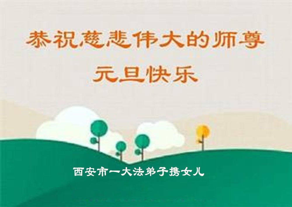 陝西省西安一大法弟子攜女兒恭祝慈悲偉大的師尊元旦快樂!