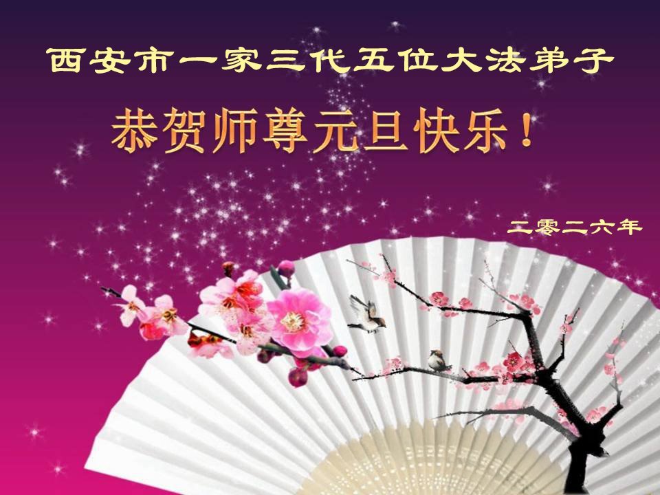 陝西榆林一大法弟子及家人恭祝慈悲偉大的師尊新年快樂!弟子與全家人真誠恭祝師父新年快樂!感恩師父慈悲救度!在新的一年裏,我們會更加珍惜這萬古不遇的修煉機緣。