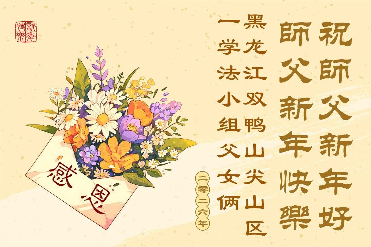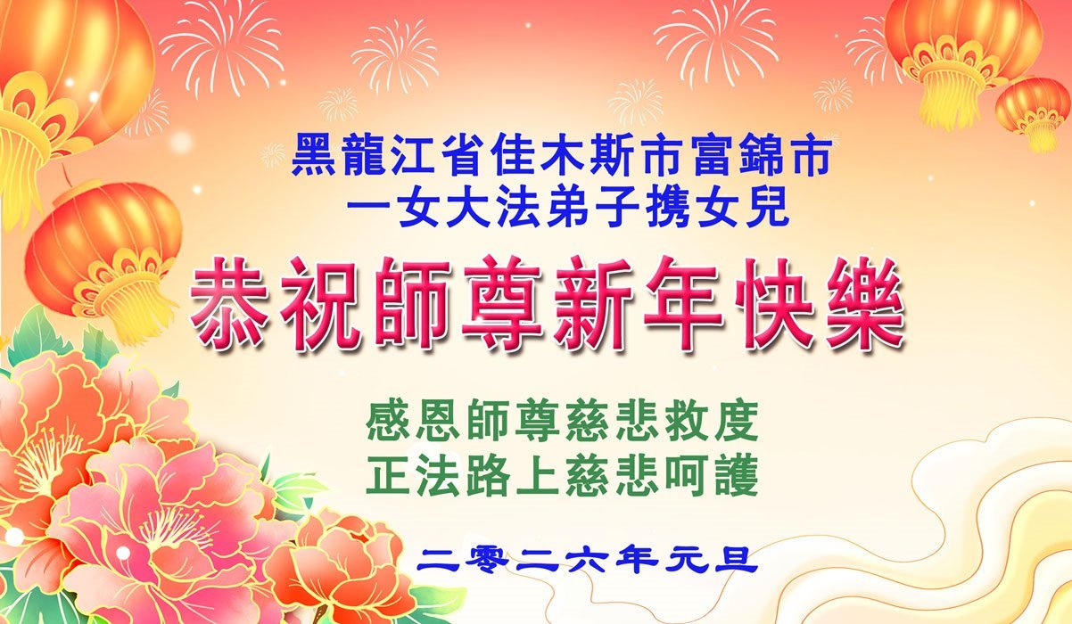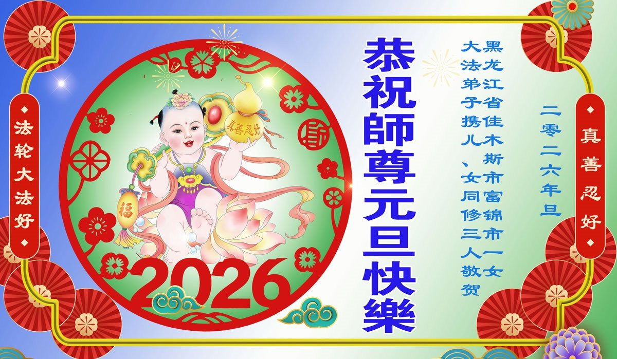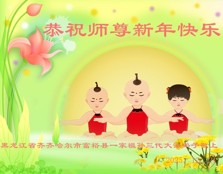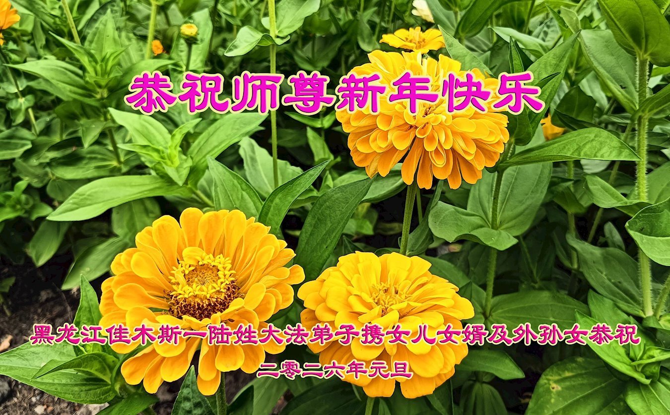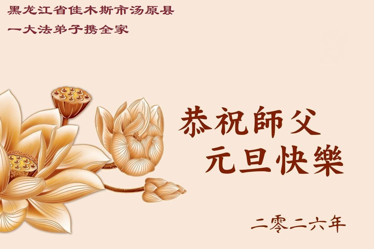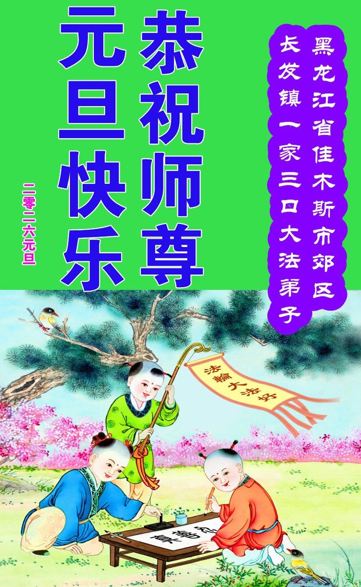黑龍江省佳木斯市一位大法弟子攜女兒女婿及外孫女恭祝師尊新年快樂!