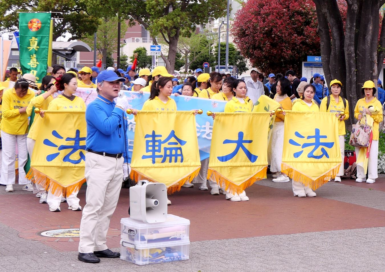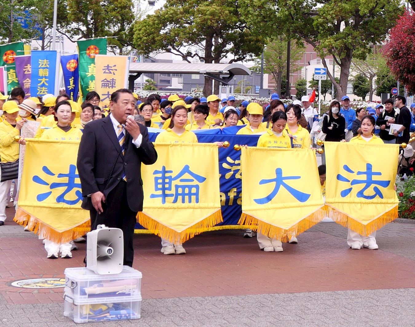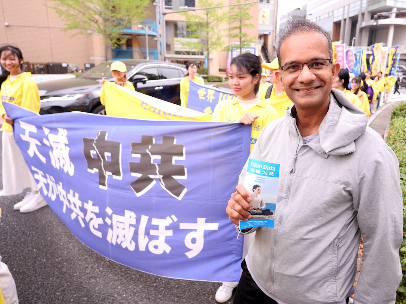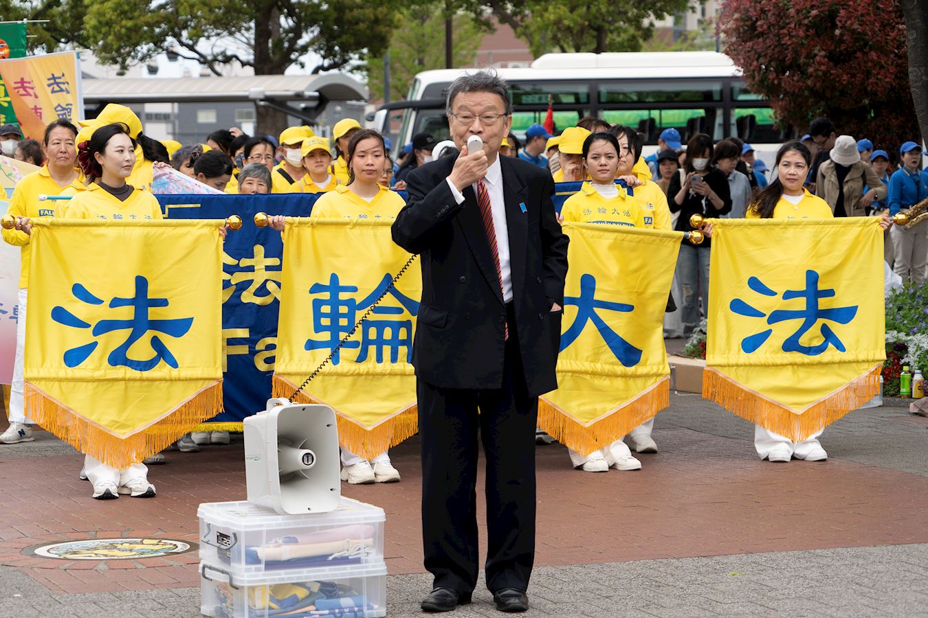 遊行出發前,前眾議院議員中津川博郷(Hirosato Nakatugawa)先生和江東區議會議員二瓶文隆(Fumitaka Nihei)先生到場聲援法輪功的反迫害活動。