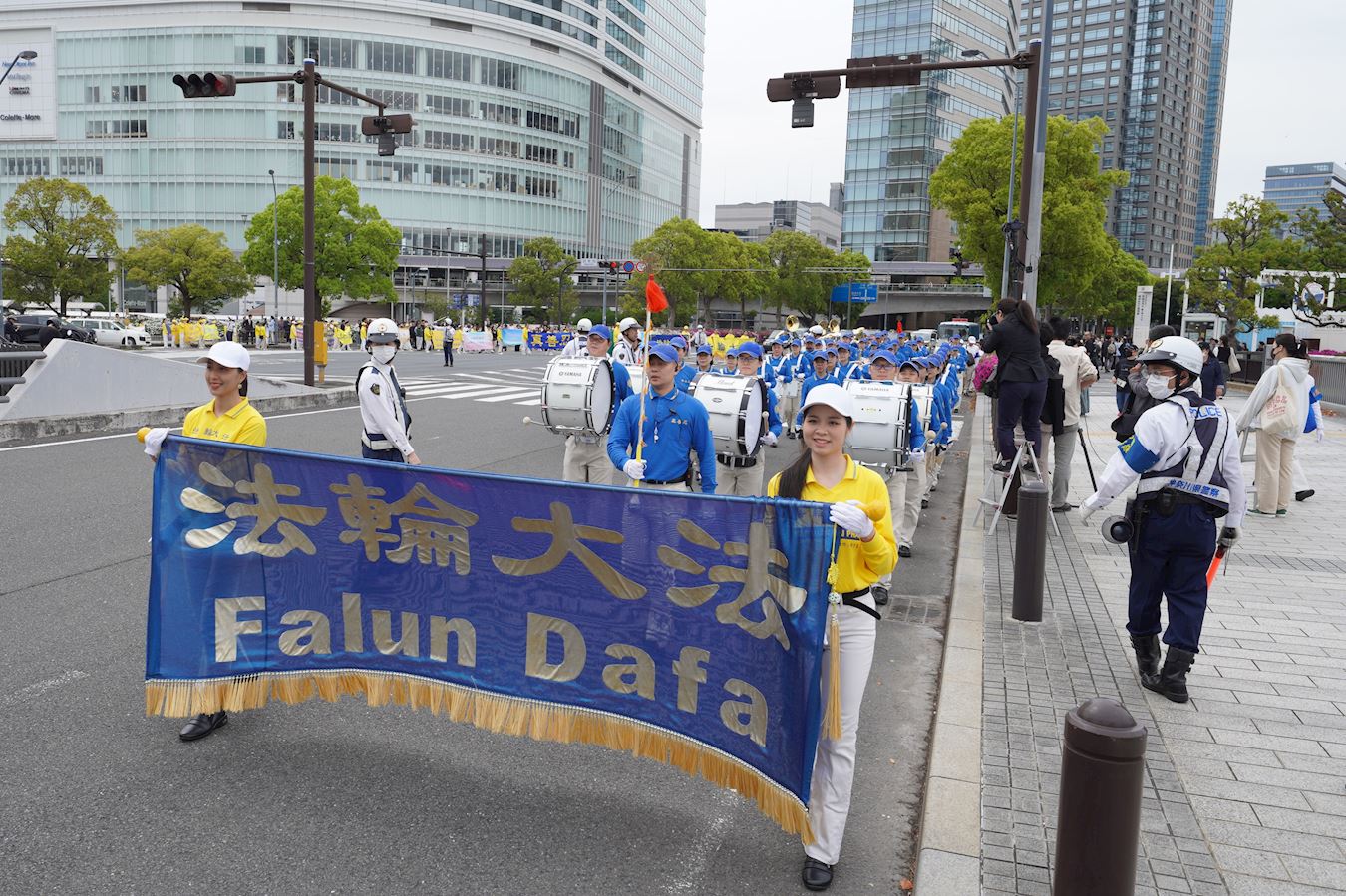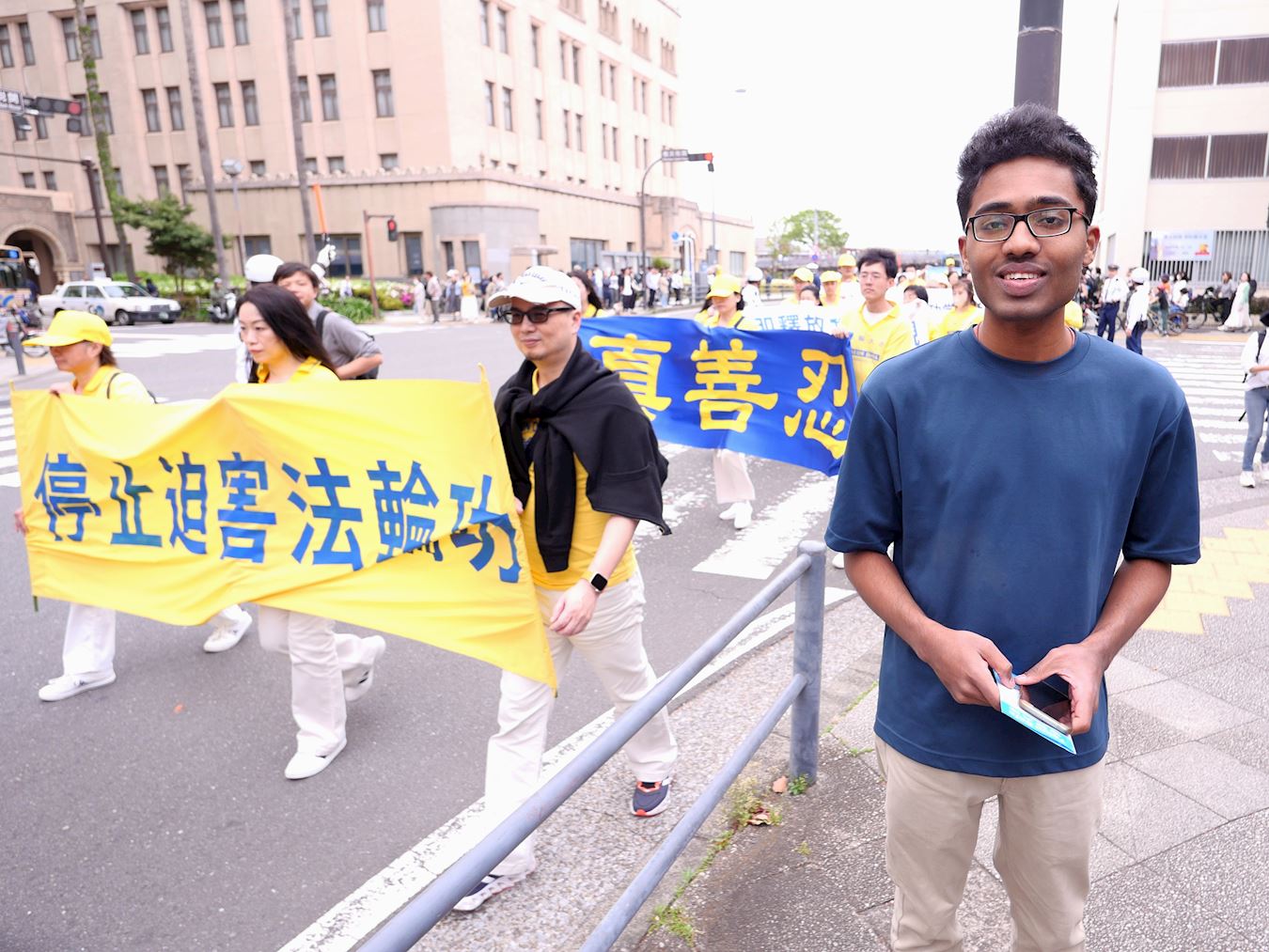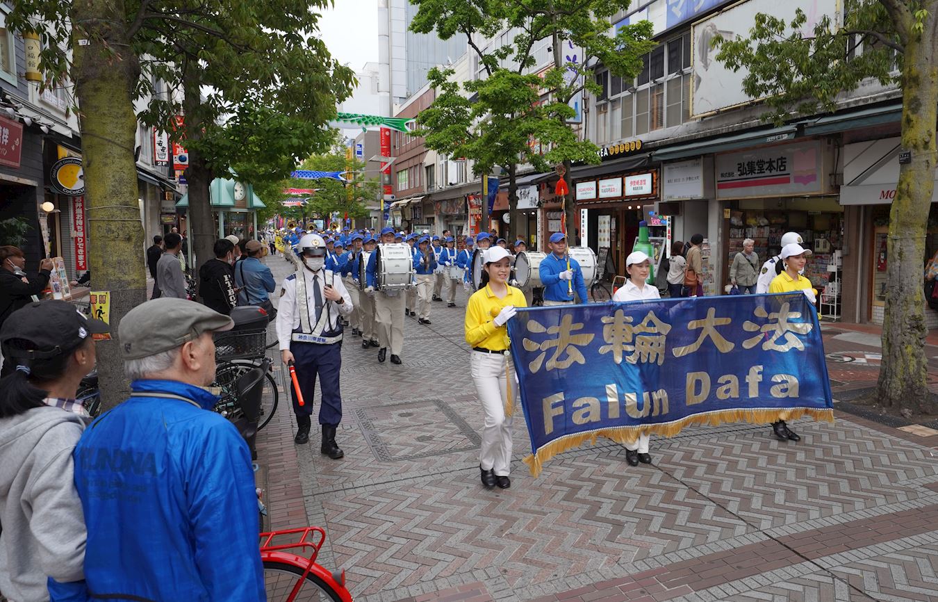 沿路的眾多遊客被遊行隊伍吸引,有的隨著天國樂團的演奏,人們紛紛鼓掌支持。沿途可以聽到日本人喊著「加油」,感覺越來越多的日本人開始將中共與中國人民區分開來。他們對遊行隊伍揮手致意等,反應非常平和友善。