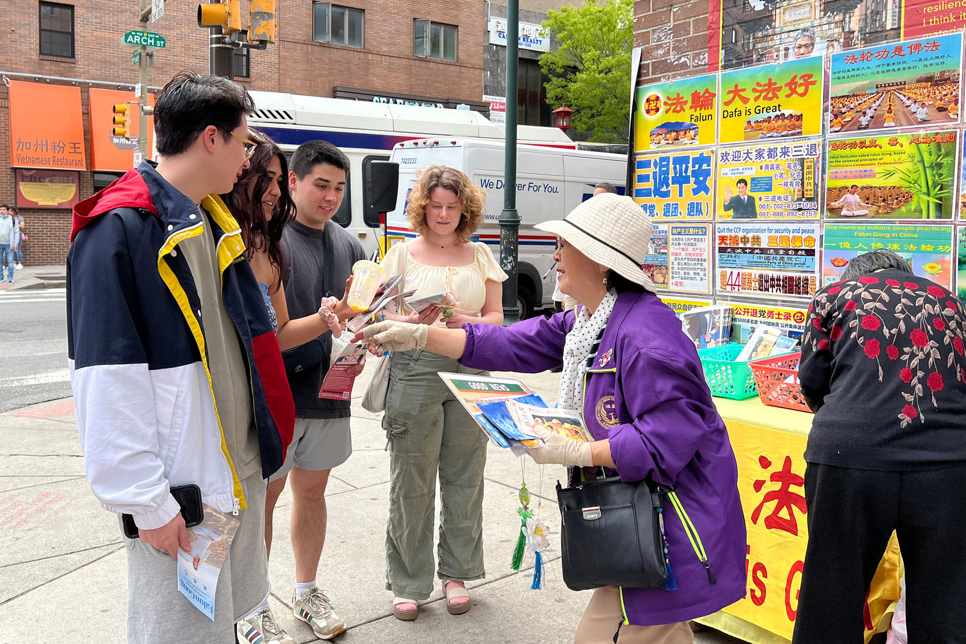 新澤西居民勞拉(Laura)當天來費城看女兒,她路過中國城時,被法輪功學員集體煉功的祥和場面所吸引,便向學員詢問了很多問題。