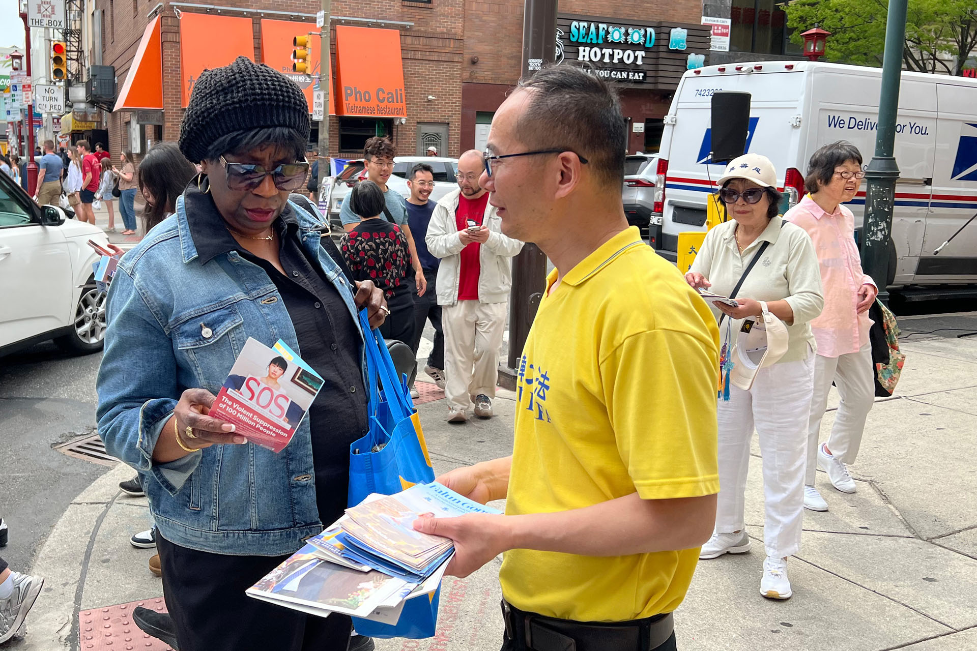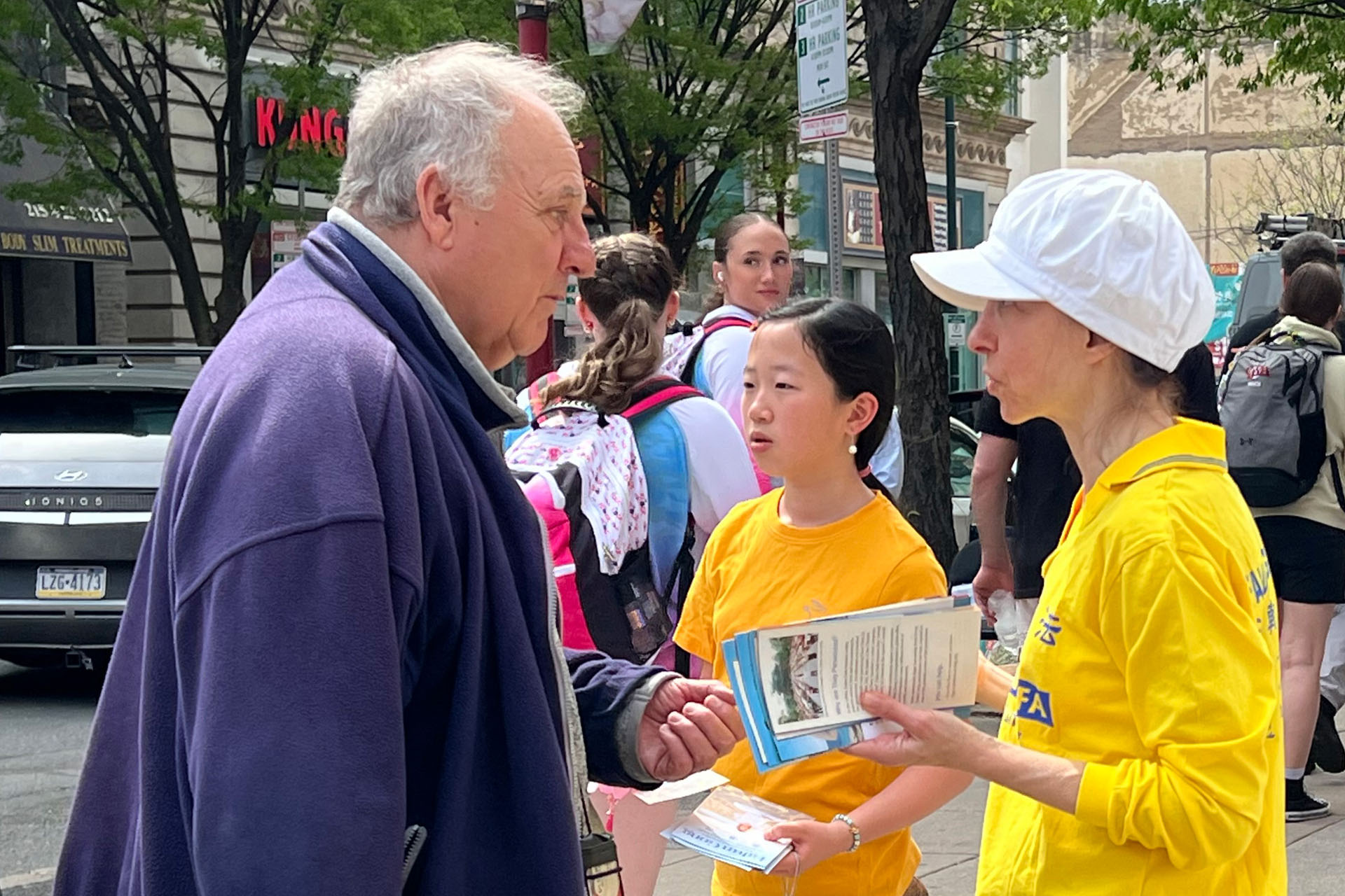 ![]() 圖4~8:二零二五年四月十九日,大費城地區舉辦集會,紀念「四﹒二五」和平上訪二十六週年。圖為法輪功學員在向過往行人講真相。 |