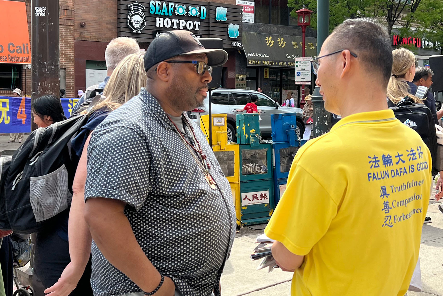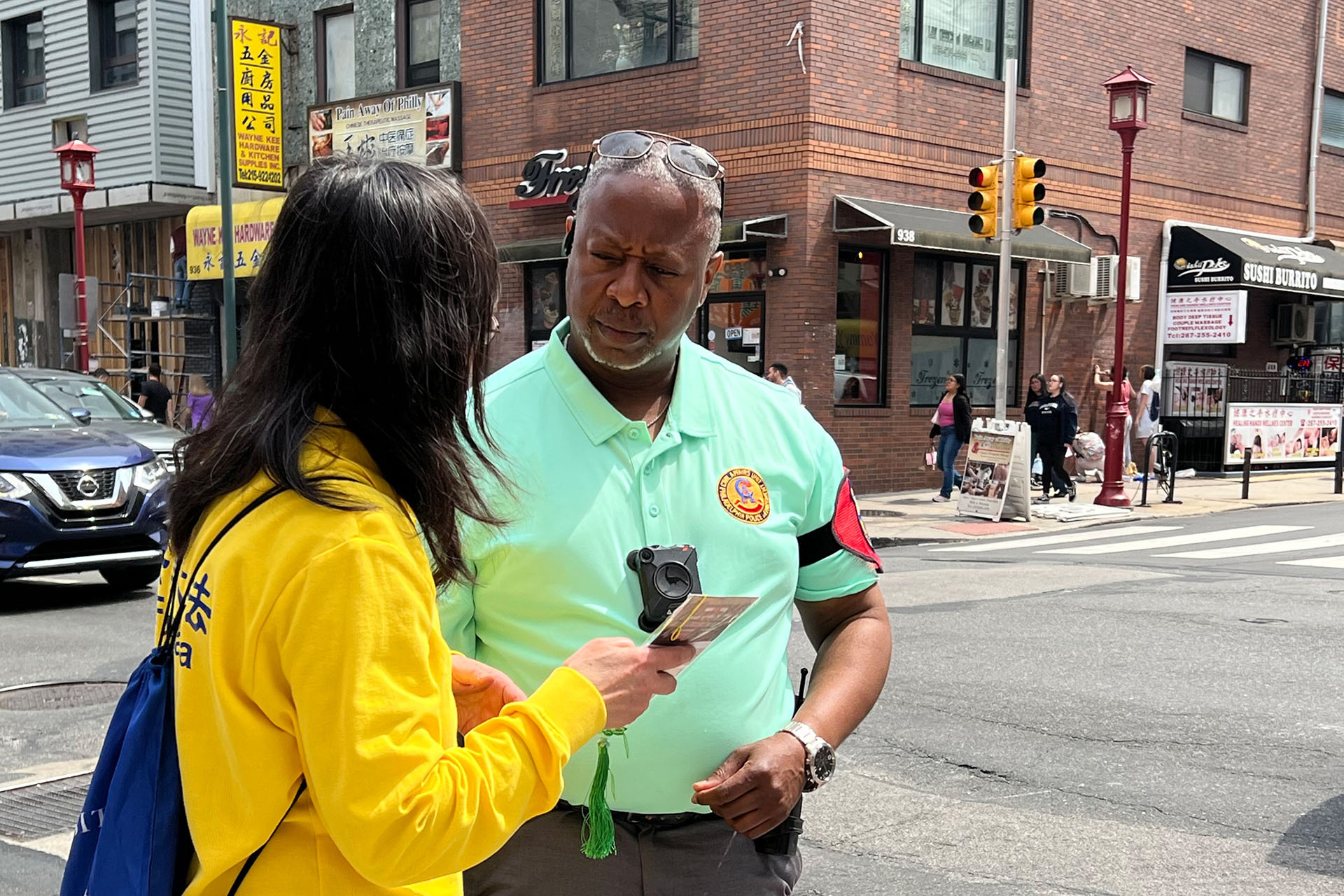 費城自由圖書館市政保安員艾薩克‧門斯基塔(saac Mensquita)路過中國城了解真相後表示,法輪功倡導的真、善、忍是普世的美好價值觀,「法輪功和許多修煉人正在做一件很偉大的事,因為他們倡導的是──真、善、忍。」