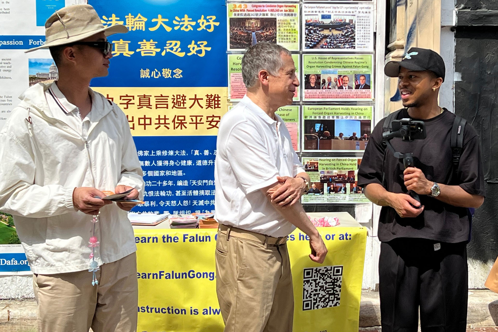 博主傑姆‧羅賓遜(Jem Robinson)當天正在中國城華埠牌樓下拍攝博客,他被集會祥和的場面吸引,駐足聽法輪功學員講述真相。