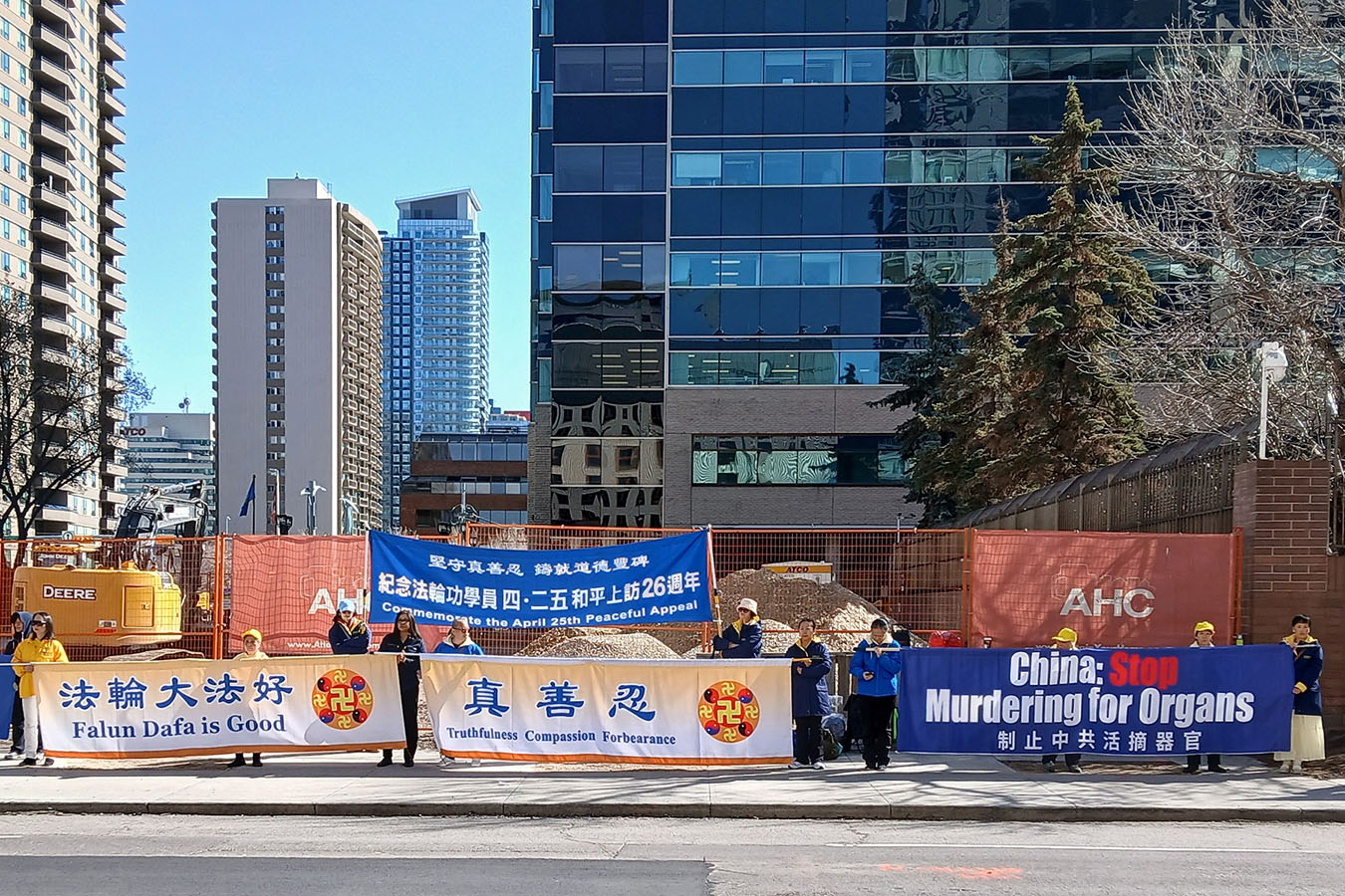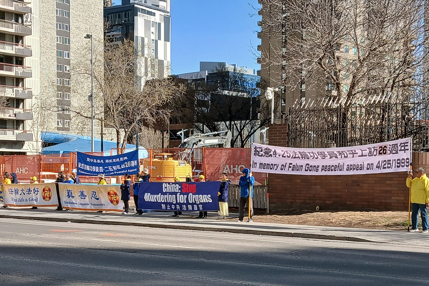 當天,卡城法輪功學員如同二十六年前中國的法輪功學員一樣,和平安靜地佇立在人行道上,手持橫幅,「紀念四‧二五法輪功學員和平上訪26週年」「法輪大法好」「真善忍」「停止迫害法輪功」「制止中共活摘器官」等標語,向路過的行人及車輛司機傳遞法輪大法的美好,同時揭露中共迫害法輪功學員的真實情況。