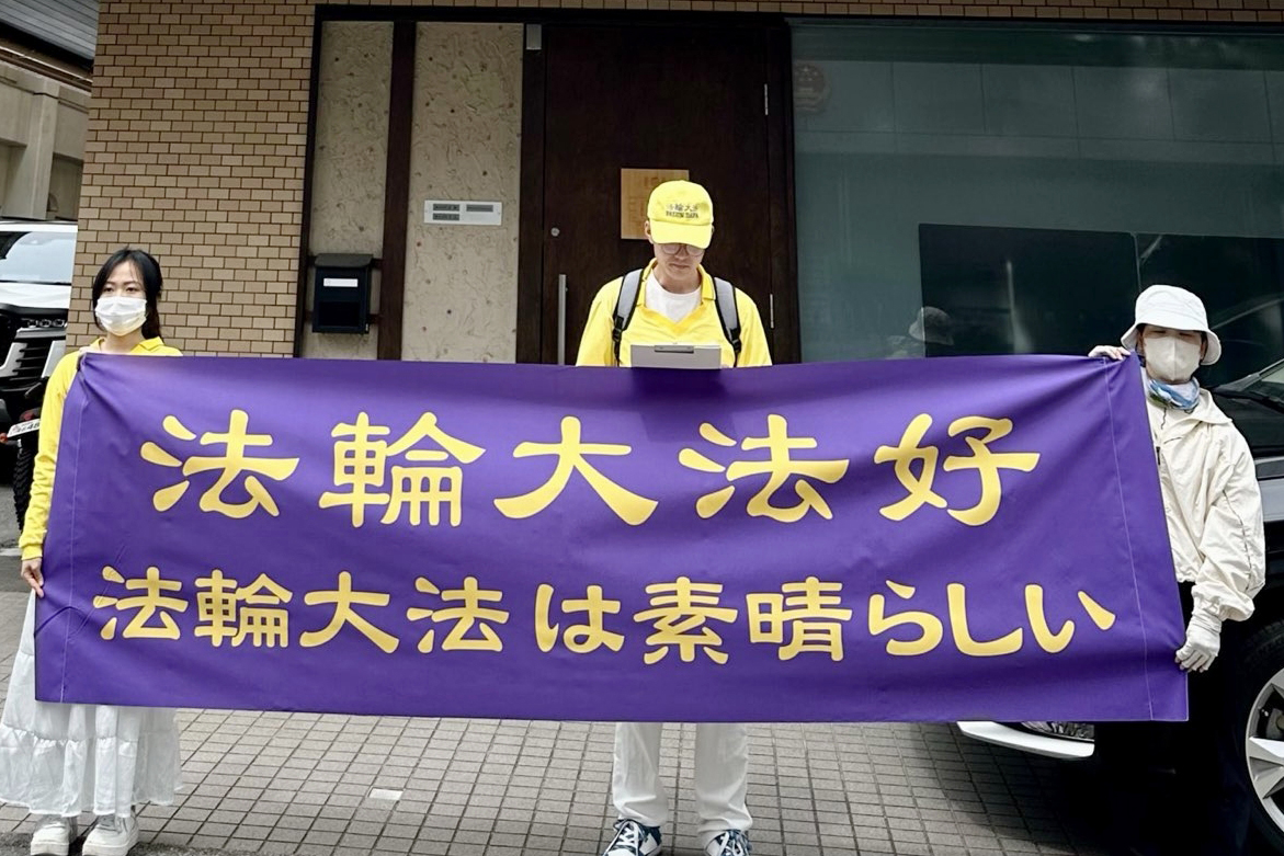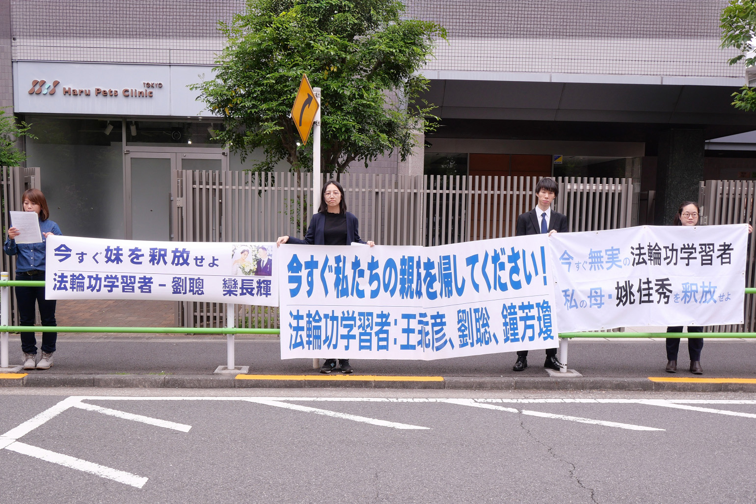 四名親人被非法關押的法輪功學員來到東京的中國駐日本大使館前宣讀了抗議聲明,要求立即釋放他們的親人。同時來自關東地區的多位學員也一同在大使館前和平抗議。