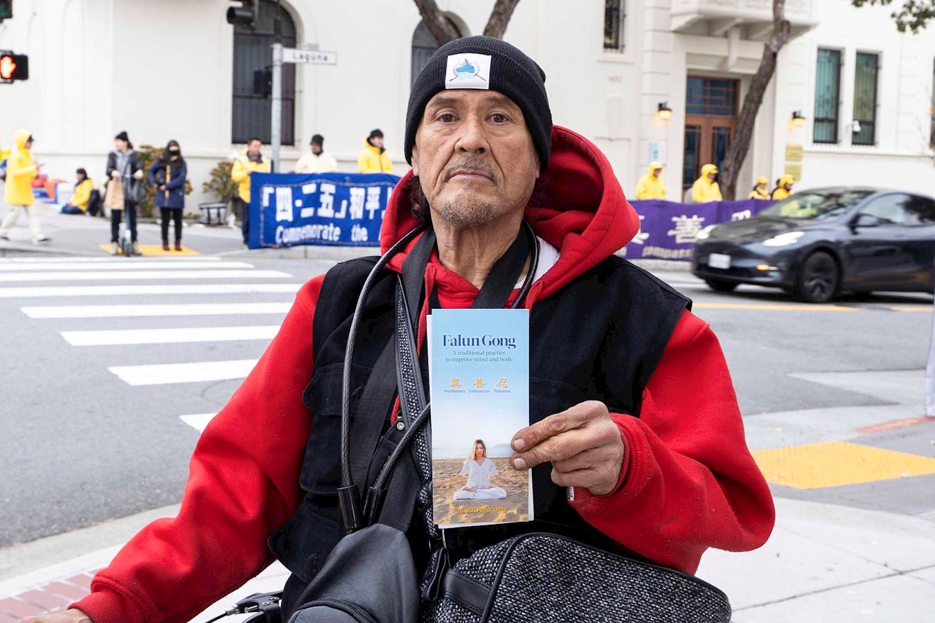 在中領館附近上班的盧卡斯(Lucas)經過法輪功學員的活動現場時表示,他支持真、善、忍,他說:「如果人們都遵循這個原則,人會彼此真誠相待,對社會有益,我會遵循這個原則。」