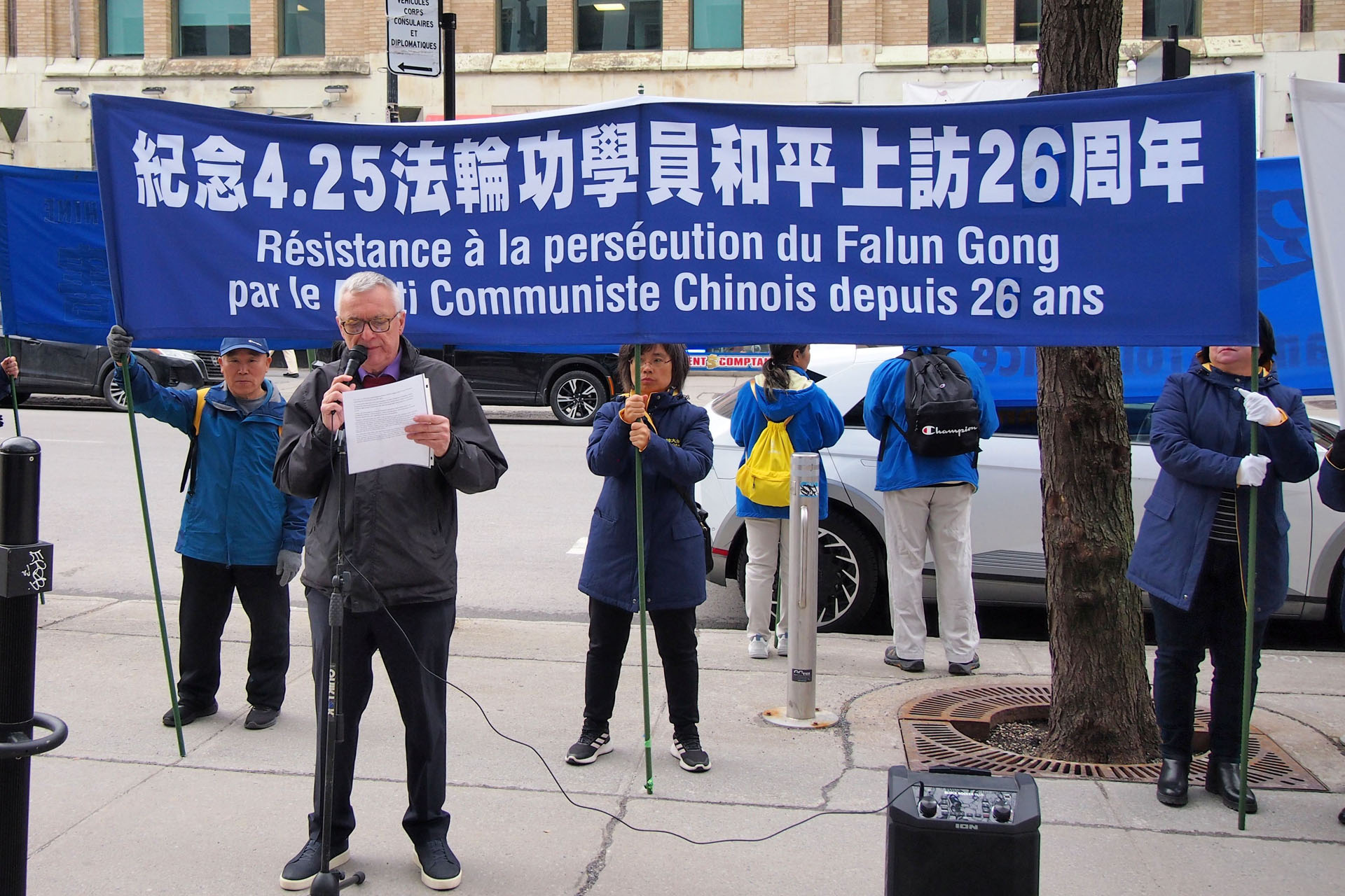 參加當日集會活動的法輪功學員羅娜(Lorna),在二十六年前的四月二十五日,前往中共駐加拿大大使館反映情況。當天上午她在煉功點上得知了天津法輪功學員被中共警察抓捕的消息,就抱著樸素的一念:讓中國政府了解法輪功的真實情況,和一些法輪功學員坐上了從蒙特利爾開往渥太華的大巴。