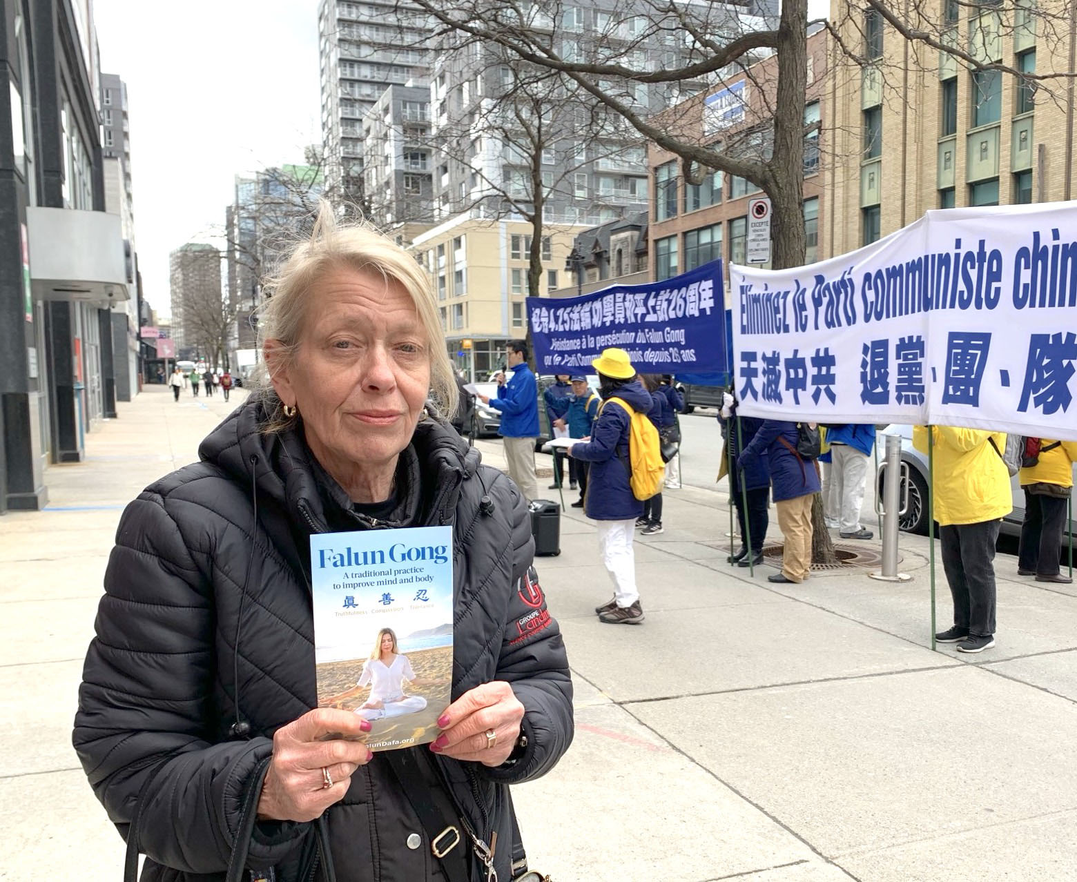 ![]() 圖3:蒙特利爾市民沙戎・布萊恩(Sharon Brien)對法輪功學員表示支持。 |