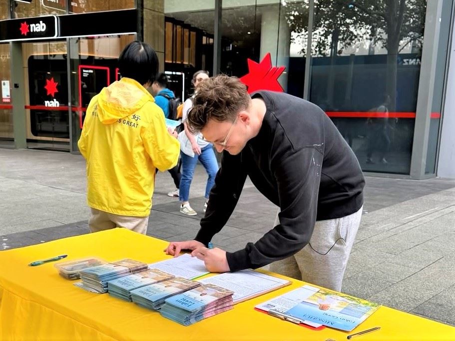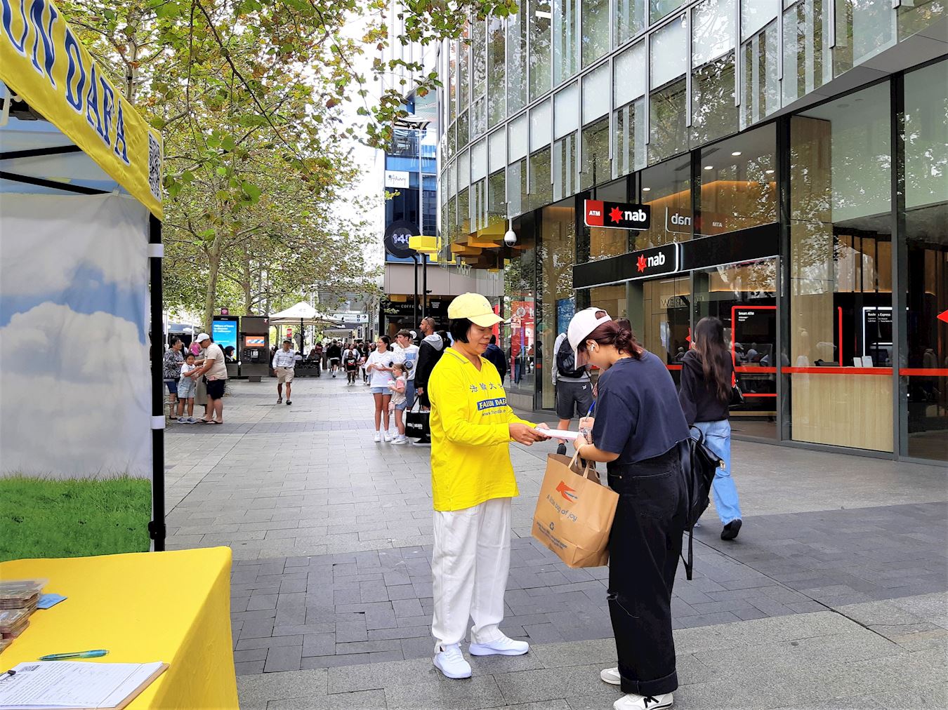 在此之前的四月十九日,在珀斯市中心默裏街購物中心步行街(Murray Street Mall),西澳法輪功學員還舉辦了傳真相活動,向人們傳遞 「四﹒二五」真相,呼籲社會各界攜手制止中共迫害法輪功。明真相的民眾表示,這是一場善與惡的抗爭,你選擇站在哪一邊?