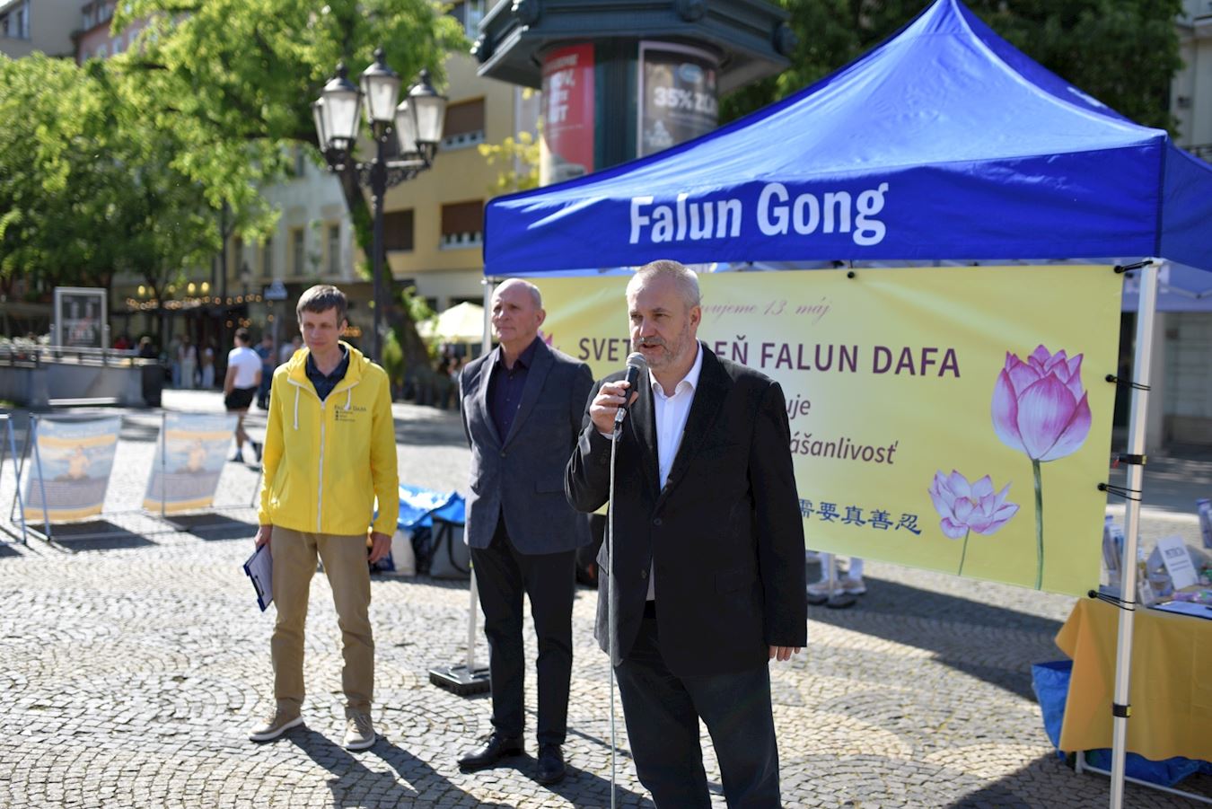 斯洛伐克法輪大法學會代表馬雷克﹒塔塔科(Marek Tatarko)首先發言,他表示,法輪功於一九九二年五月十三日由創始人李洪志先生在中國首次公開傳出,今年是第三十三週年,「法輪功和真、善、忍的價值觀廣受歡迎。」世界各國政府開始採取行動支持法輪大法,例如,二零二五年五月五日,美國眾議院全票通過《法輪功保護法案》。