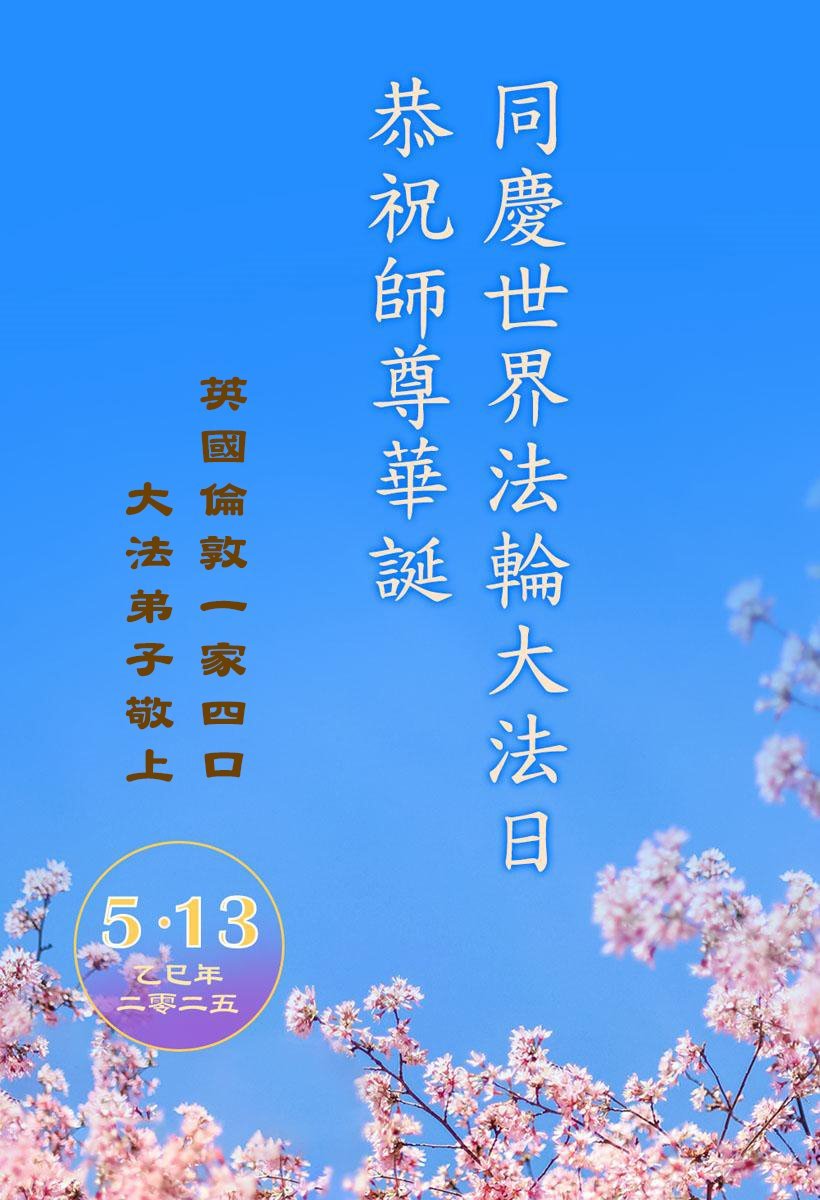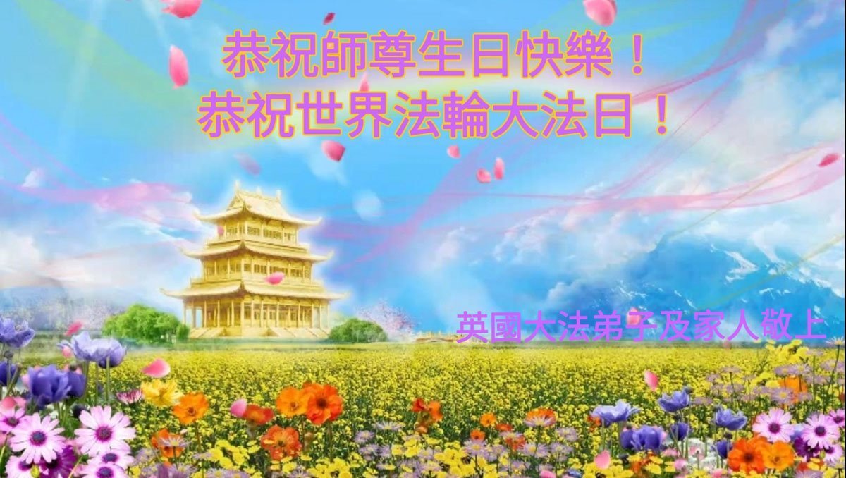 英國一大法弟子及家人恭祝慈悲偉大師尊生日快樂!普天同慶世界法輪大法日!