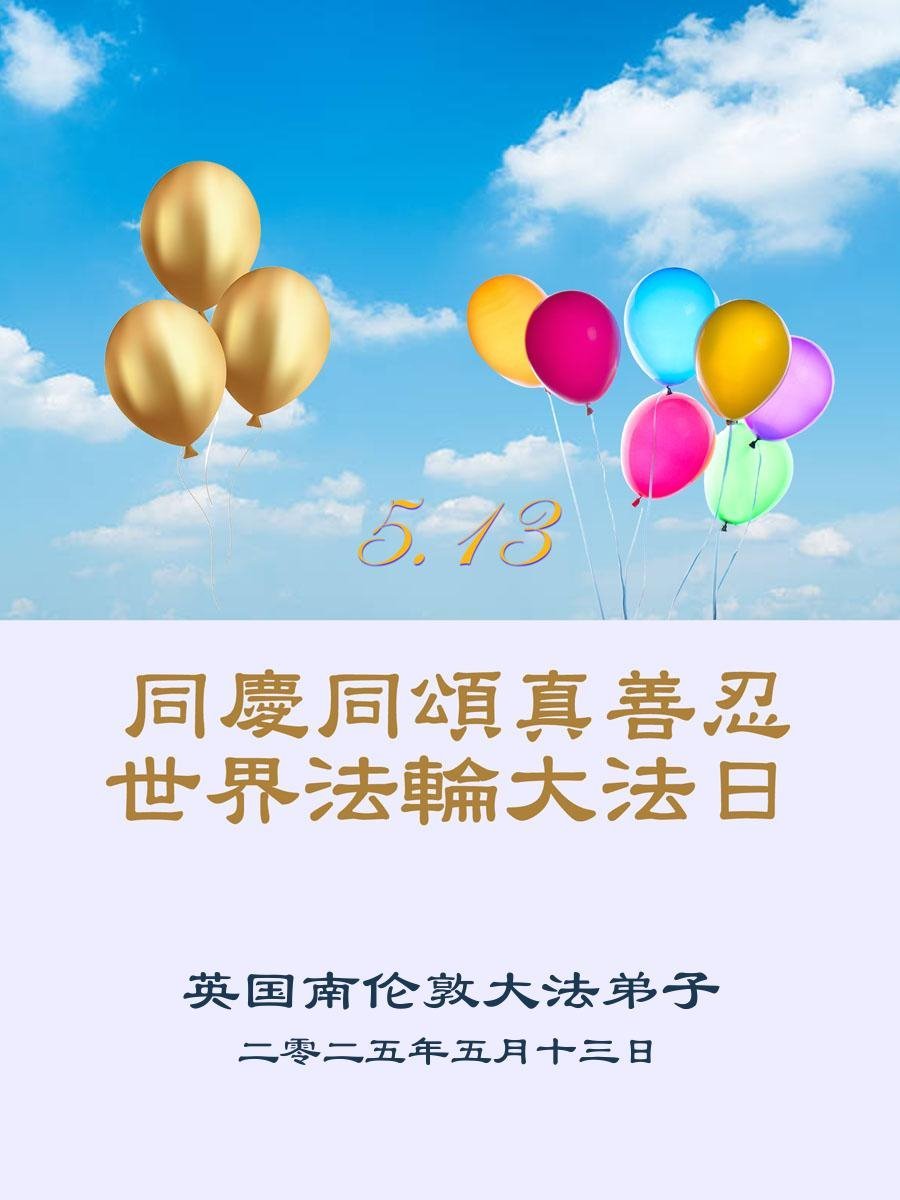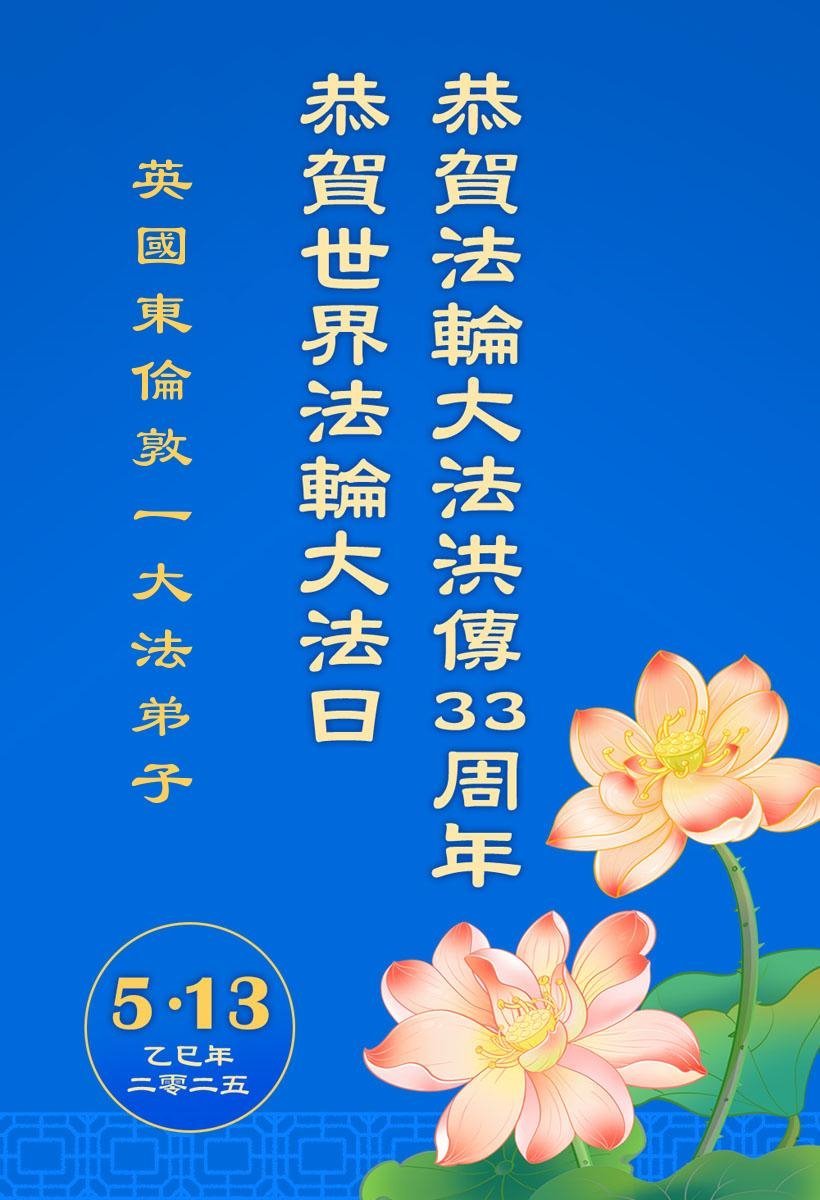 英國西倫敦一大法弟子恭賀世界法輪大法日!恭賀法輪大法洪傳33週年!