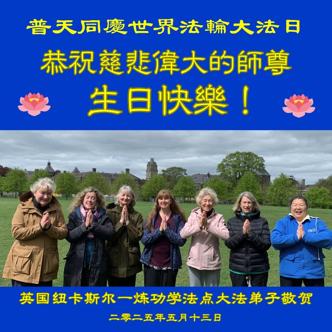 英國紐卡斯爾一煉功學法點大法弟子恭賀世界法輪大法日!