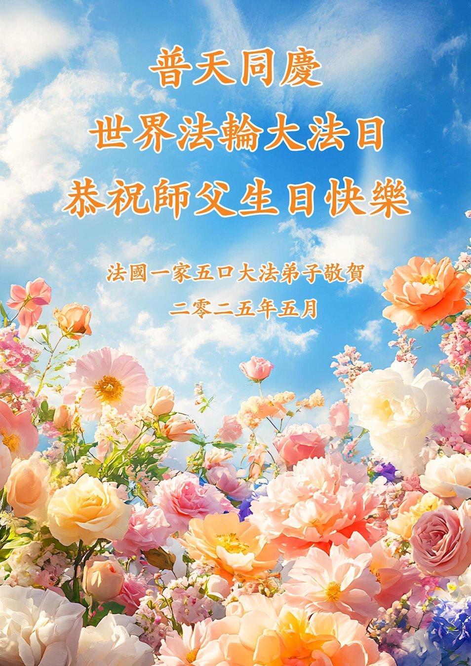 浩蕩師恩之下,大穹新生,萬宇得度,弟子們與眾生對師父和大法無比感恩之心難以言表。在這普天同慶、萬眾感恩的聖日裏,法國大法弟子向慈悲偉大的師尊問好!