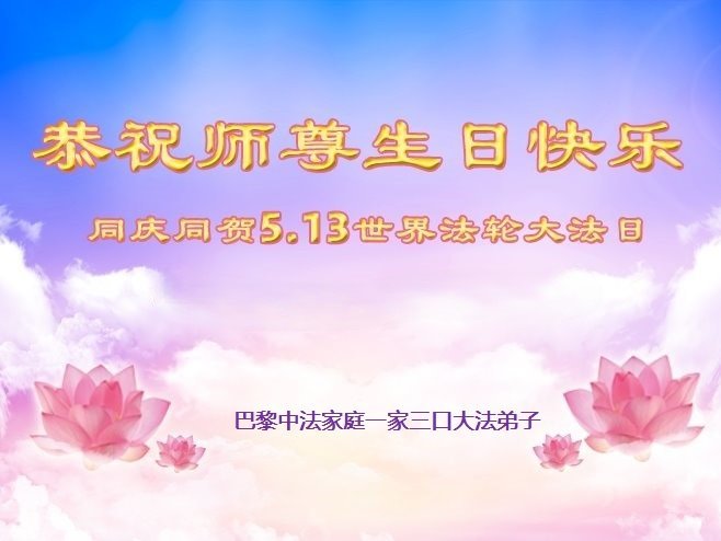 法國巴黎中法家庭一家三位大法弟子恭祝師尊生日快樂!