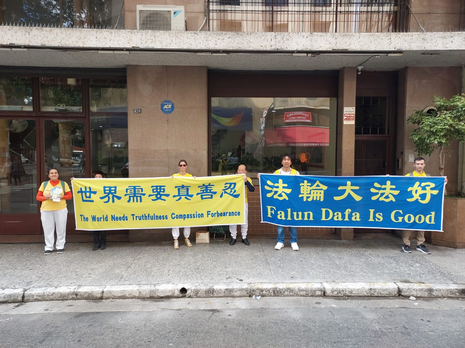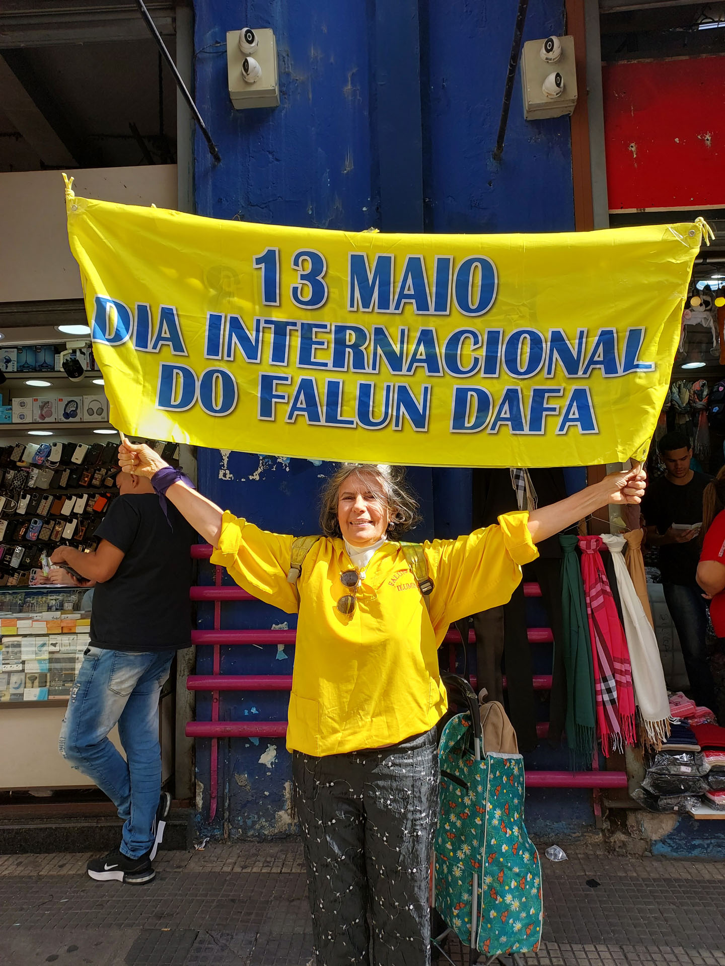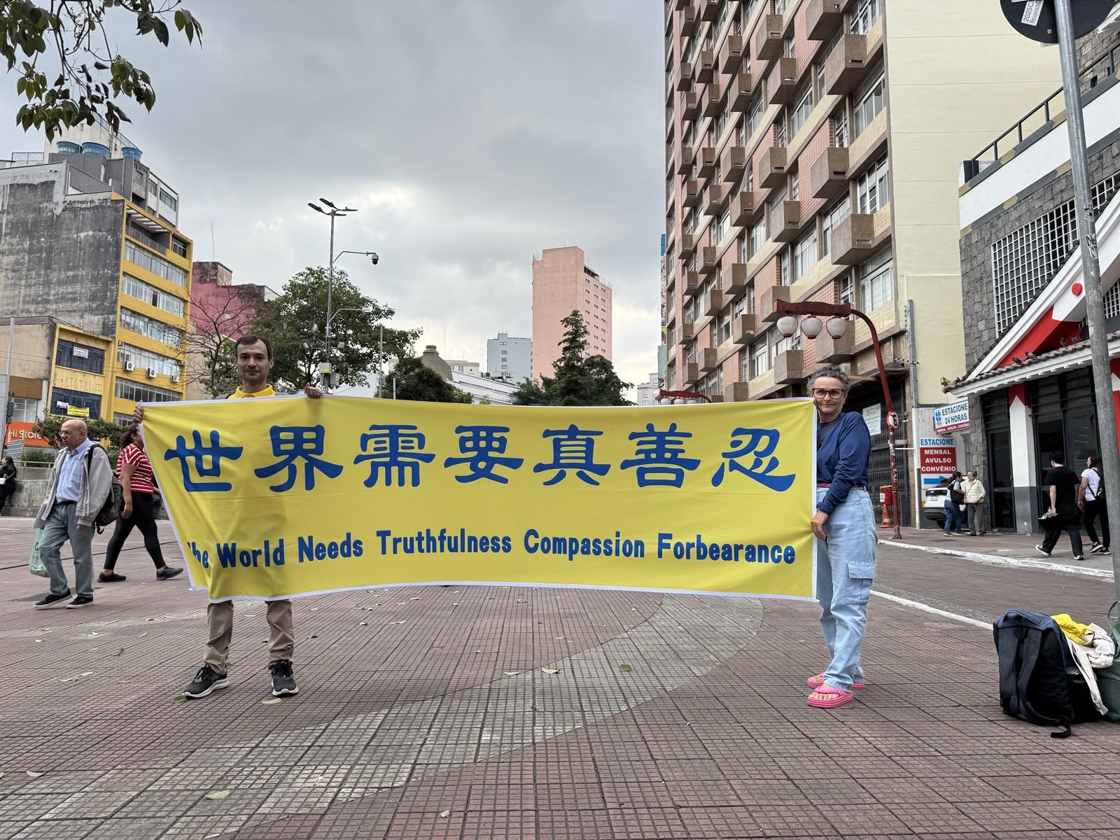 【明慧網二零二五年五月十五日】二零二五年五月十三日是世界法輪大法日,在這個重要偉大的日子,巴西聖保羅學員聚集在市中心展開橫幅、講真相發傳單、慶祝這個殊勝的日子,與此同時讓更多的民眾了解法輪功的美好以及中共迫害法輪功的真相。