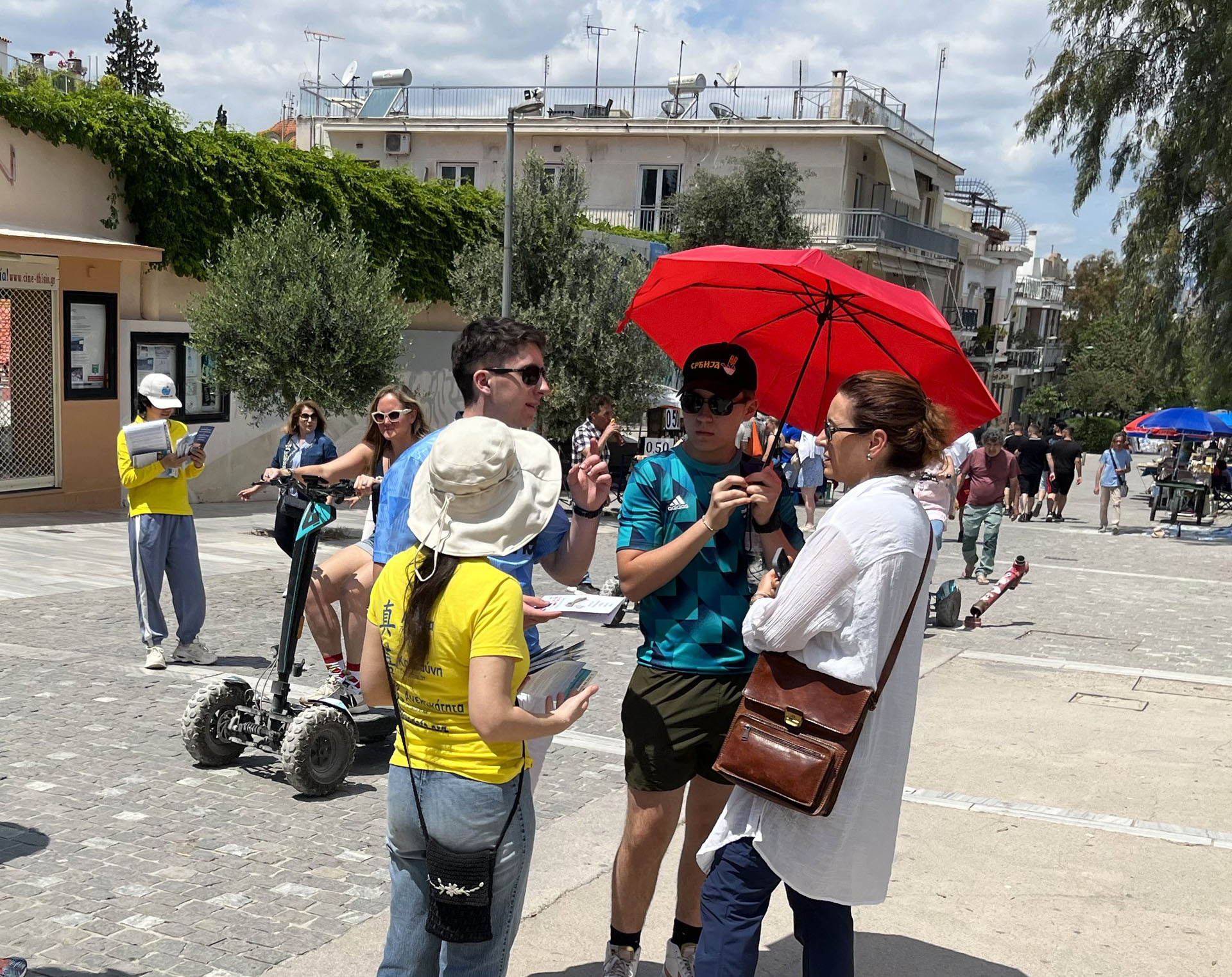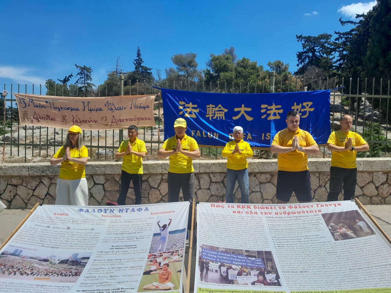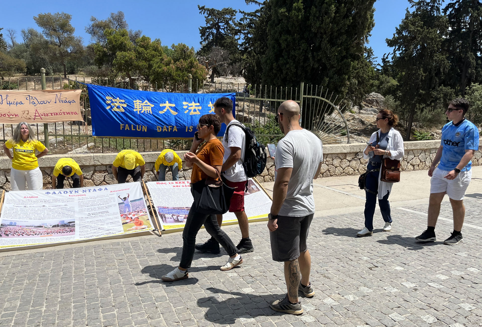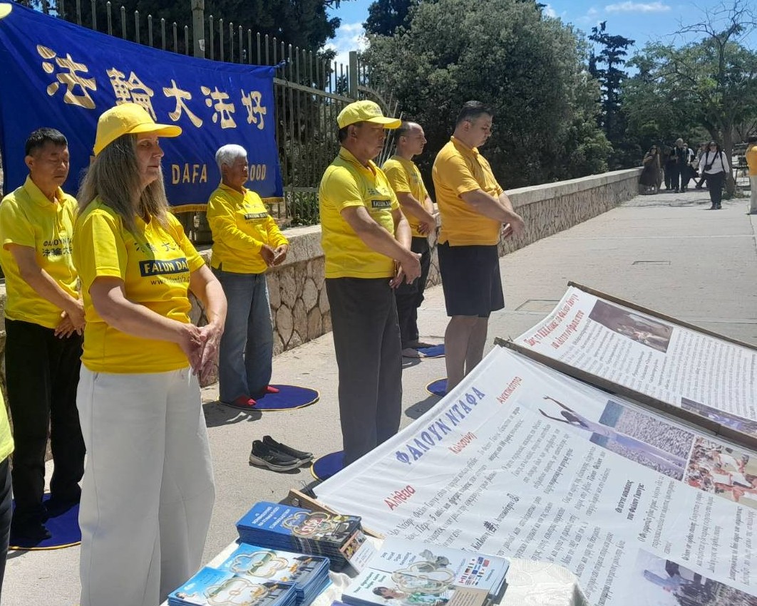 【明慧網二零二五年五月十六日】二零二五年五月十一日(星期日),希臘雅典的部份法輪功學員聚集在蒂西奧(Thiseio)慶祝世界法輪大法日。他們演示法輪功五套功法,並向過往的路人介紹法輪大法的美好。