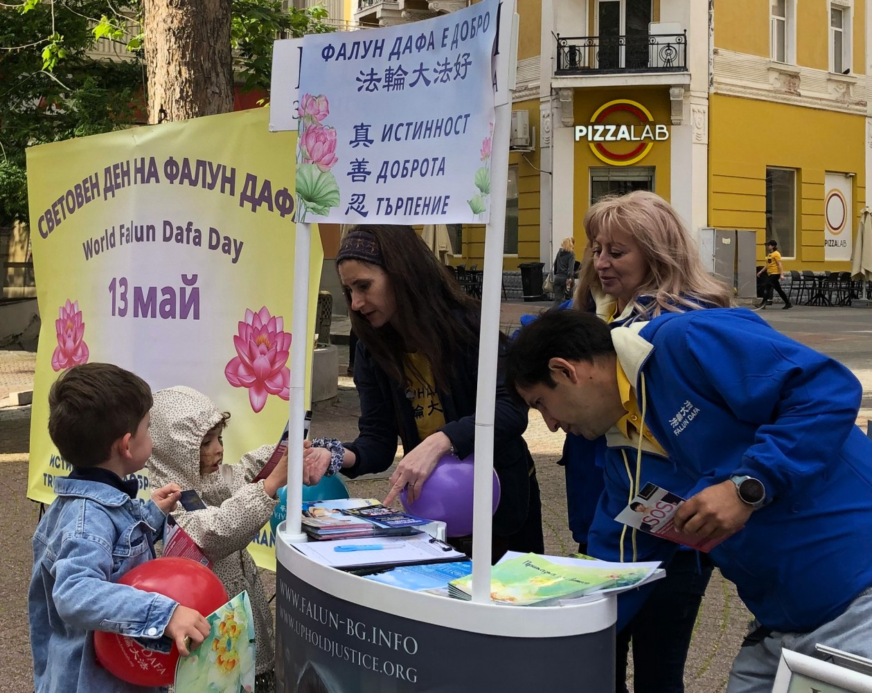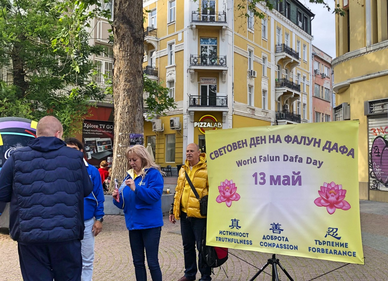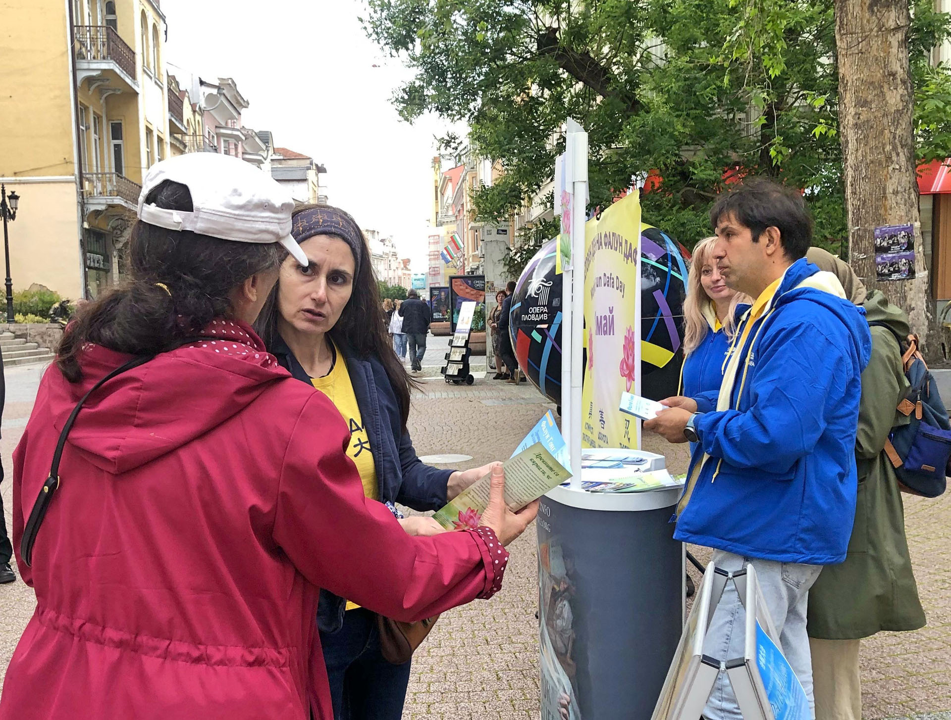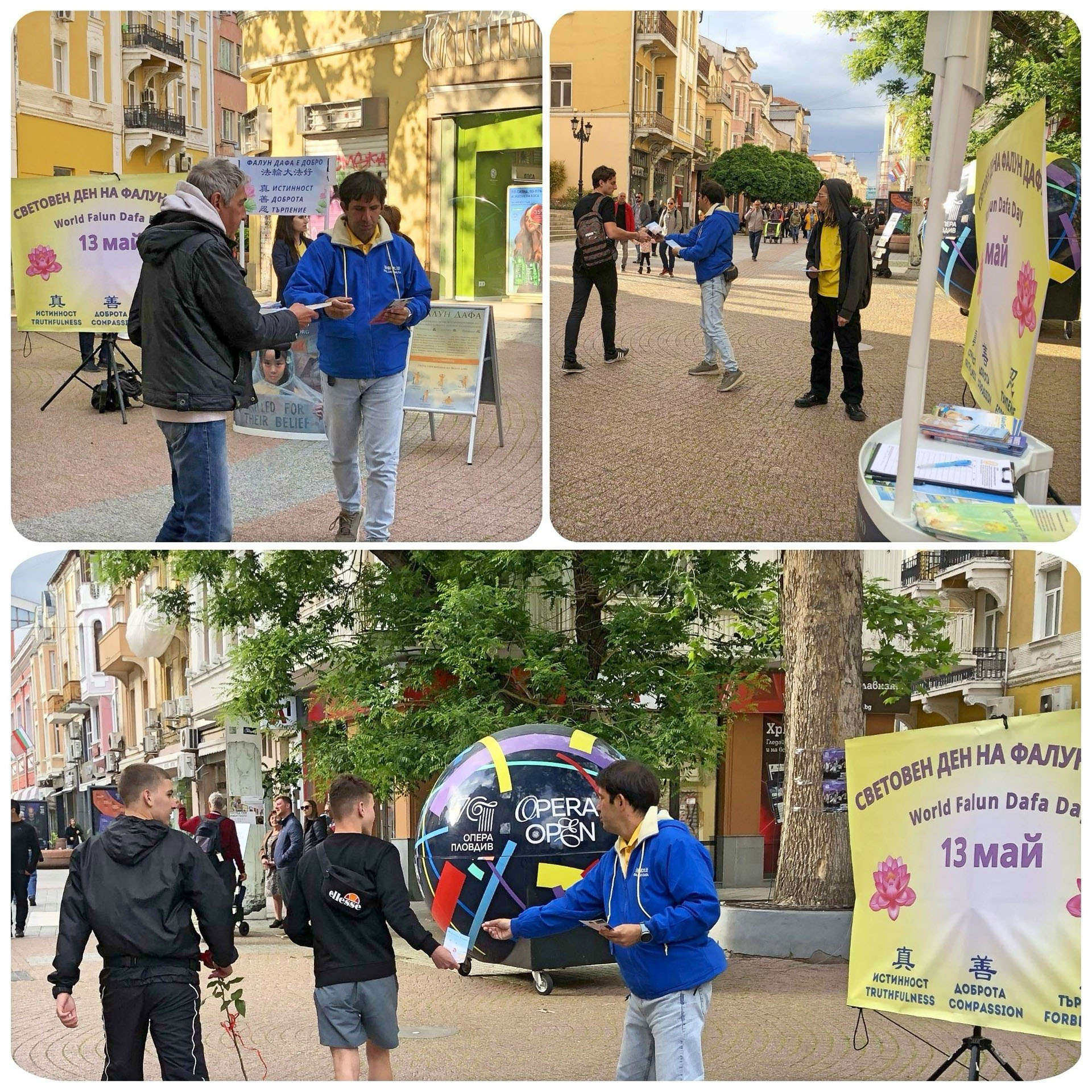 二零二五年五月十三日,法輪功學員來到普羅夫迪夫的著名地標之一──位於主要步行街上的卡梅尼察台階前,他們在這裏設置了裝飾一新的信息展位,橫幅內容與慶祝「世界法輪大法日」主題相呼應。
