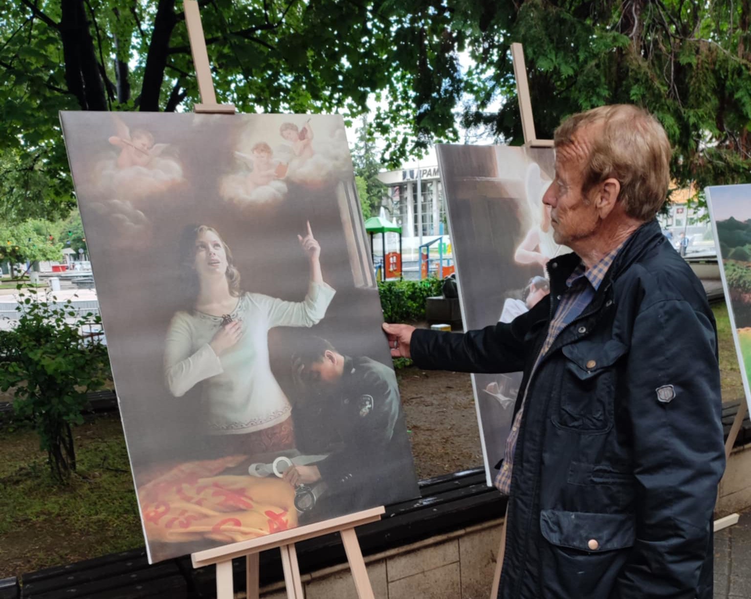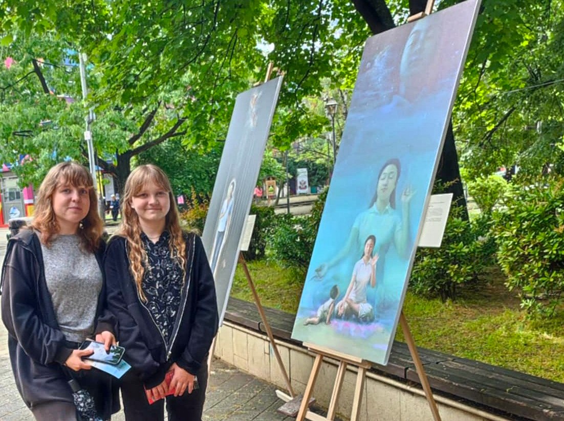 二零二五年五月十日,法輪功學員在帕紮爾吉克市中心的區域歷史博物館和鐘樓前,舉辦了「真善忍美展」。他們向路人講解了每一幅作品的背景,許多人對此非常感興趣,有人說:「畫作非常美麗!」「真漂亮!」