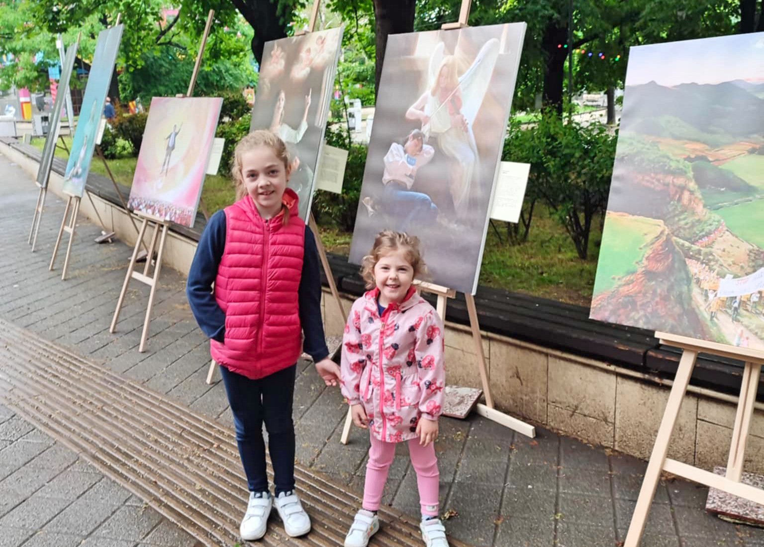 孩子們驚嘆地說:「這些畫真漂亮!」 她們還在畫作前拍照。